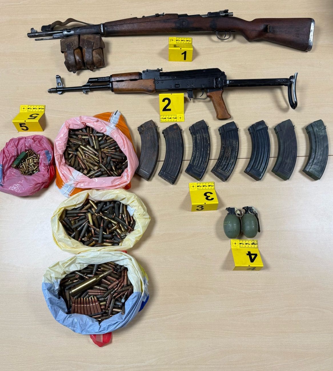 Tijekom pretrage pronađeni su i od njega oduzeti: jedna automatska puška, sedam pripadajućih spremnika bez streljiva, jedan vojni karabin, dvije ručne bombe, 667 komada streljiva kalibra 7,62x51 mm, 115 komada streljiva kalibra 7,9 mm, jedno streljivo kalibra 12,7 mm, dva komada streljiva kalibra 9x19 mm, jedna lovačka patrona kalibra 16 mm te 64 komada streljiva malog kalibra.