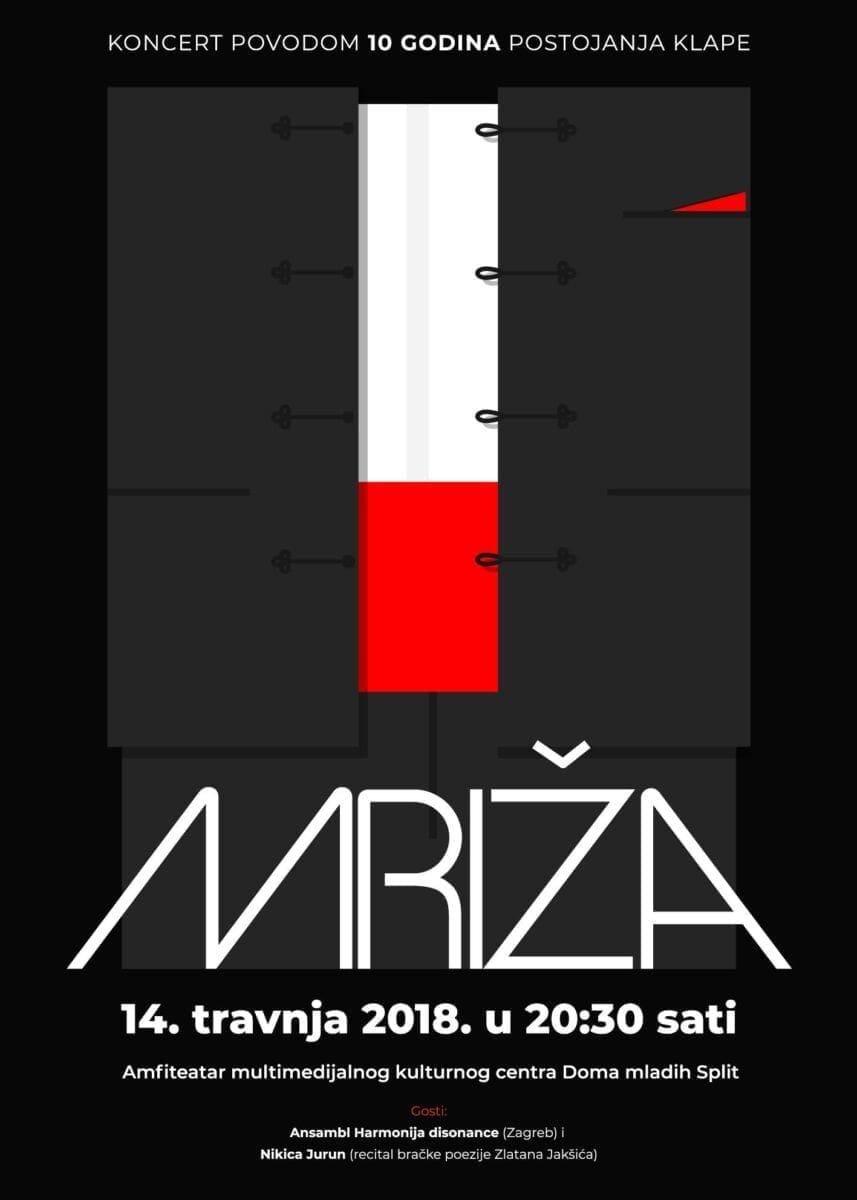 Koncert klape Mriža je presjek njihovog desetogodišnjeg vrijednog rada obilježenog brojnim uspjesima i nagradama te je poklon vjernim slušateljima i gradu Splitu, a održat će se u subotu, 14. travnja u amfiteatru Multimedijalnog kulturnog centra u sklopu Doma mladih (Ulica slobode 28) u Splitu u 20.30 sati.