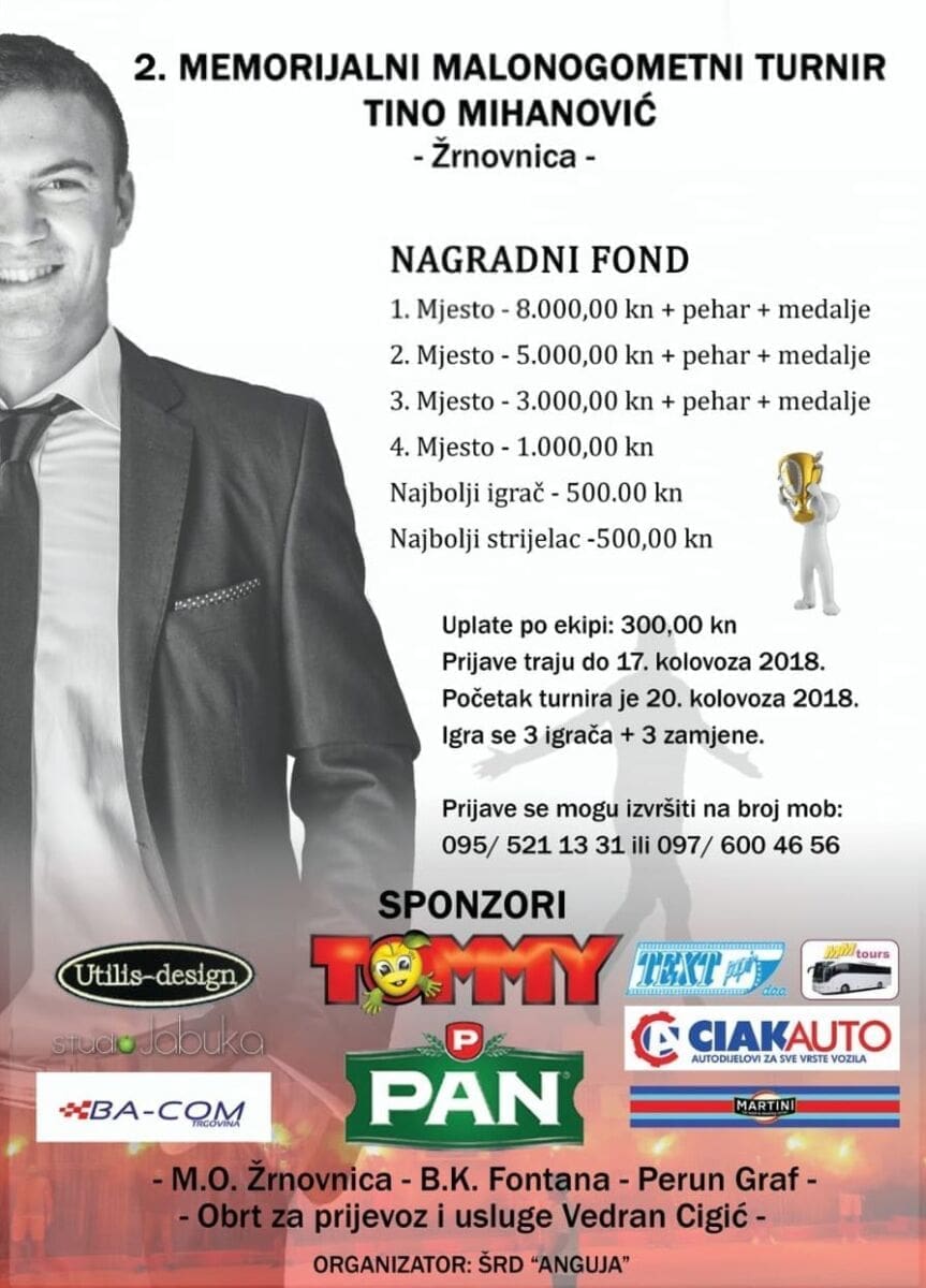 Drugi Memorijalni turnir Tino Mihanović počinje u Žrnovnici 20. kolovoza 2018. godine, a prijave traju do 17. kolovoza.