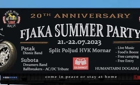 Proslava dvadesete obljetnice Moto kluba FJAKA koja će se održati na na uobičajenoj lokaciji Lučice Mornar u Splitu, imat će humanitarni karakter. Fjaka Summer Party trajat će od 21. do 22.0+7.2023., u petak će nastupiti Dioniz band, a u subotu Dreamers Band i Ballbreakers - AC/DC Tribute.