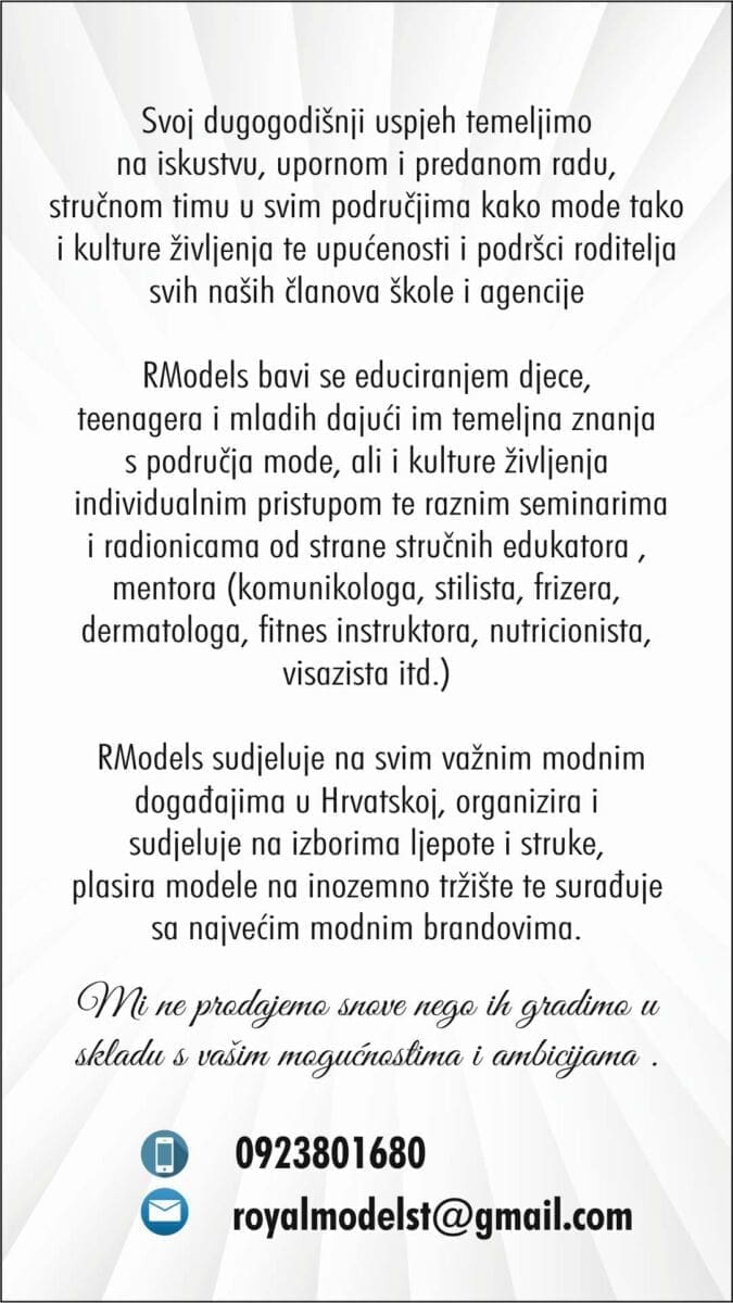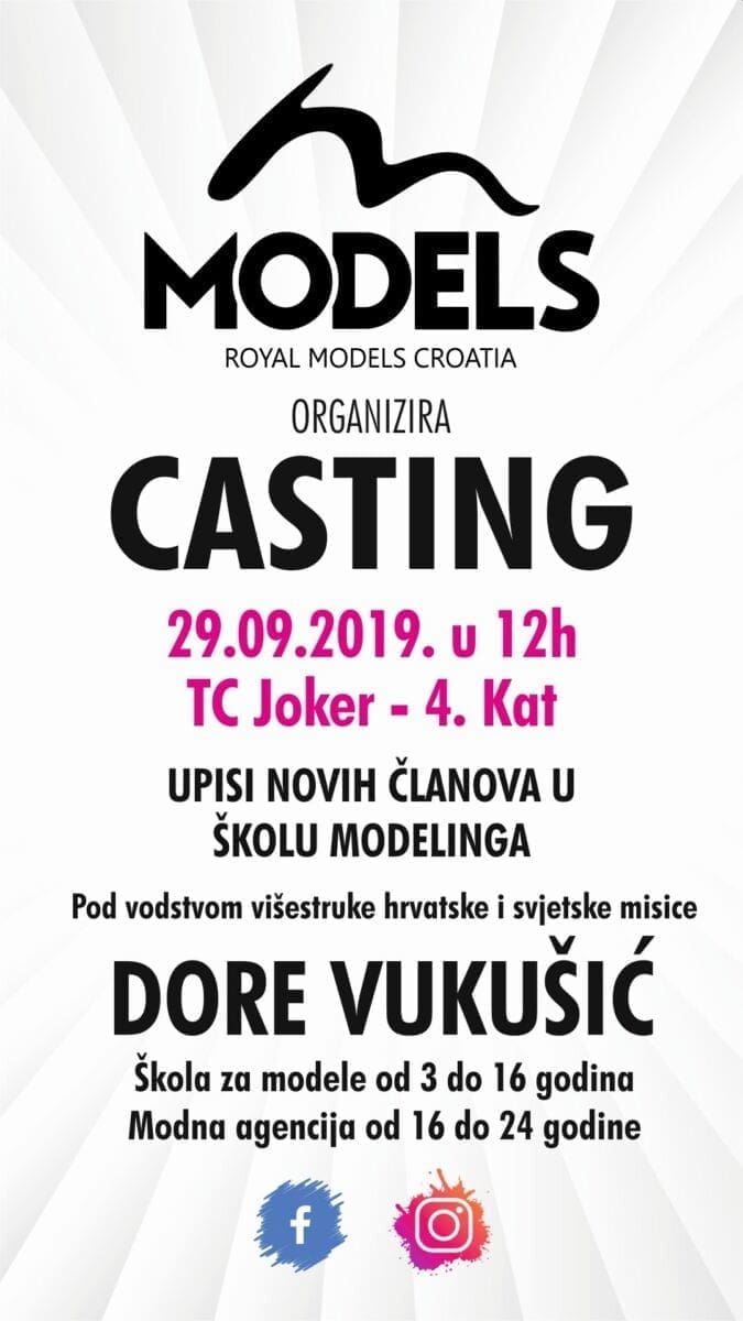 ROYAL MODELS CROATIA organizira casting u nedjelju, 29.rujna u 12 sati na 4. katu TC Joker povodom upisa novih članova u školu modelinga i agenciju.