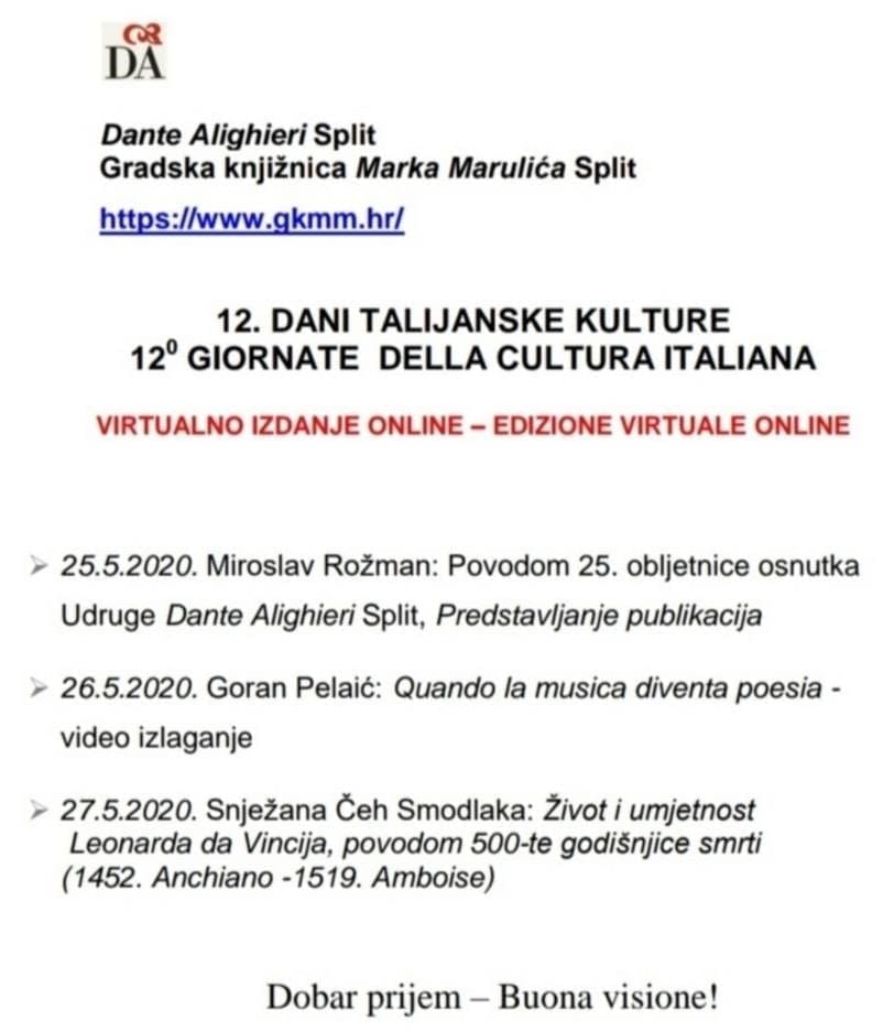 U ponedjeljak počinju Dani talijanske kulture, tim povodom posredstvom Gradske knjižnice Marka Marulića održat će se tri online predavanja.