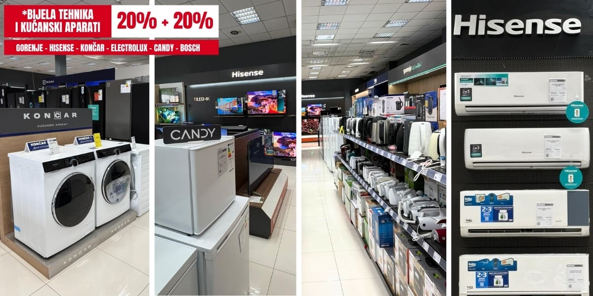 Bijela tehnika - 20% + 20% popusta na brendove: Gorenje, Hisense, Končar, Electrolux, Candy i Bosch.