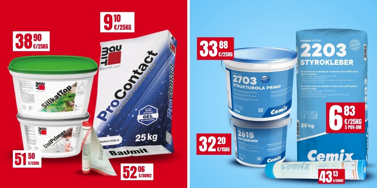 Iako građevina nije uključena u akciju 20% + 20%, očekuju vas posebne pogodnosti za fasade na brendovima Cemix i Baumit! Uz to, osigurali smo i mogućnost besplatne dostave na vašu adresu. Više detalja potražite na odjelu građevine.