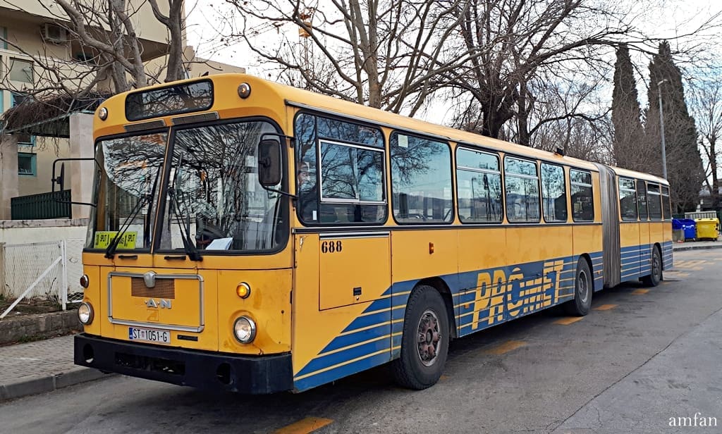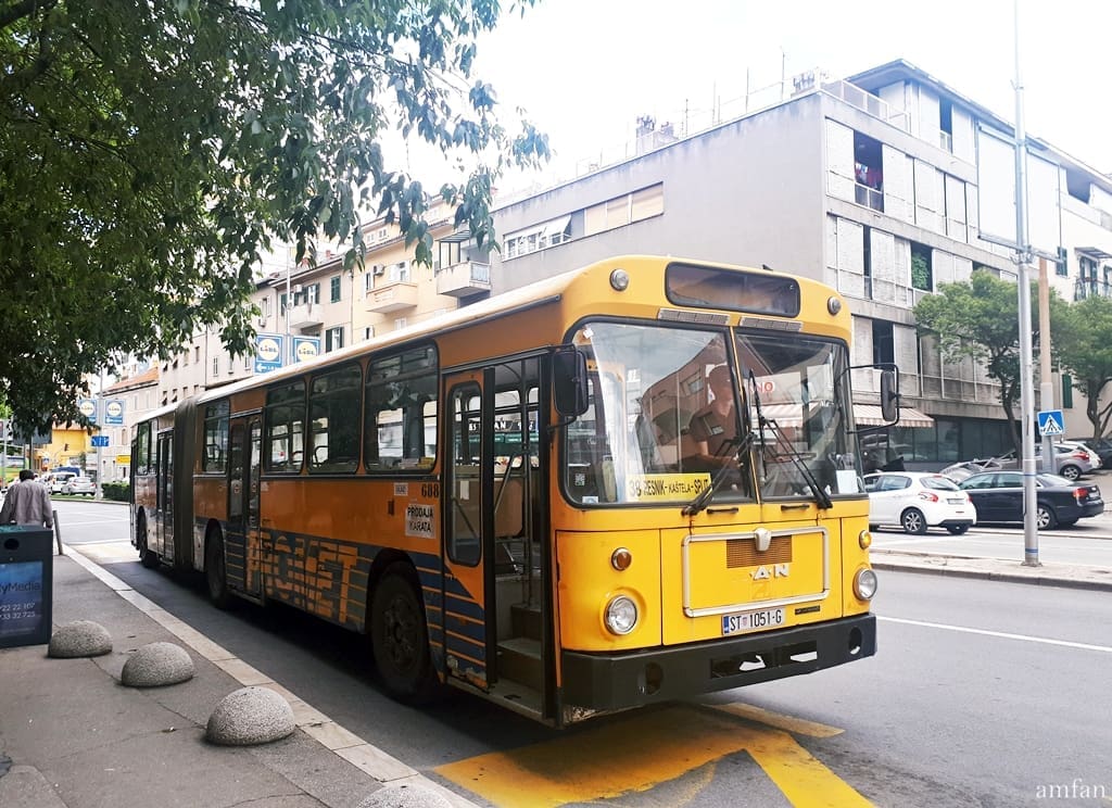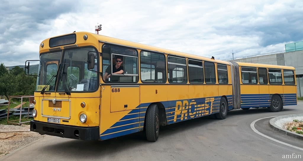 - Dok smo prolazili kroz Kaštela na povratku, u jednom momentu vidio sam kako sva četiri putnika na stanici sa suprotne strane ceste sinkronizirano pomiču svoj pogled prema #688. Četvrtog u tome nije spriječio ni mobitel po kojem je tipkao. I nisu bili jedini. Pogledajte kako samo taj autobus potpuno iskače kad se iza njega nalazi toranj moderne splitske zračne luke. Po cijeloj ruti viđao sam kako se ljudi okreću prema #688 i zadržavaju pogled, što je reakcija koju nijedan drugi Prometov autobus ne može proizvesti. U tome leži cijela bit mog uživanja u vožnji sa #688. Ona je nešto što doslovno ne možete okusiti niti u jednom drugom gradu. Naravno, u Dubrovniku još voze SU 220, ali nedostaju im dvije stvari: oni nemaju prikolicu čija konfiguracija stvara potpuno drugačiji doživljaj vožnje i, bitnije, u puno su boljem stanju pa se toliko ne čini da na sebi nose trideset godina vožnje po gradu i povijesti firme. #688 pak još uvijek ima originalni pod.