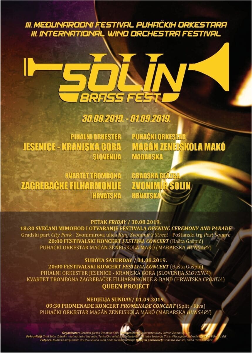 3. Međunarodni festival puhačkih orkestara "Solin Brass Fest 2019" održat će se od 30. kolovoza do 01. rujna u Solinu i Splitu.