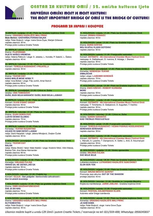 Broj mjesta je ograničen uz poštivanje epidemioloških mjera. Simbolična cijena ulaznice je 30kn i moguće je kupiti preko sustava CROATIA TICKETS ili osobno u CZK Omiš (Punta 1.), rezervacije na br.021/559-400. ili whatsApp ; 095/8245837.