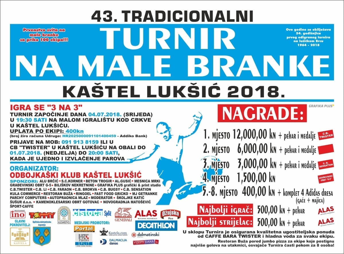 S obzirom na to da smo već imali 100 ekipa iz naše i susjednih županija, Udruga Sv. Lovre od Ostroga i Odbojkaški klub Kaštel Lukšić kao organizatori postavljaju letvicu još više, pa se sad želi 101 ekipa, aludirajući na 101 dalmatinca. U okviru glavnog turnira, održat će se i veteranski turnir s 8 pozvanih ekipa, dječji turnir U 13, te jednodnevni turniri u basketu, stolnom tenisu i odbojci, tako da će publika uživati i u ostalim sportskim granama.I ove godine je predviđen bogati nagradni fond od preko 25 000 kn s peharima i medaljama za najbolje ekipe i pojedince, a uz samo sportsko događanje organizatori nude i bogatu ugostiteljsku ponudu (hrana i piće), besplatne lutrije i nagrade, tako da će svatko biti zadovoljan. Ulaz će kao i svake godine biti slobodan.Ovim putem pozivamo sve ekipe koje su ljubitelji malih branki iz Splitsko-dalmatinske županije i šire da se prijave i svojim sudjelovanjem doprinesu veličini događaja, te da jednostavno guštaju i pokušaju otići do kraja ovog malobrankaškog Wimbledona, a sve informacije su na plakatu!