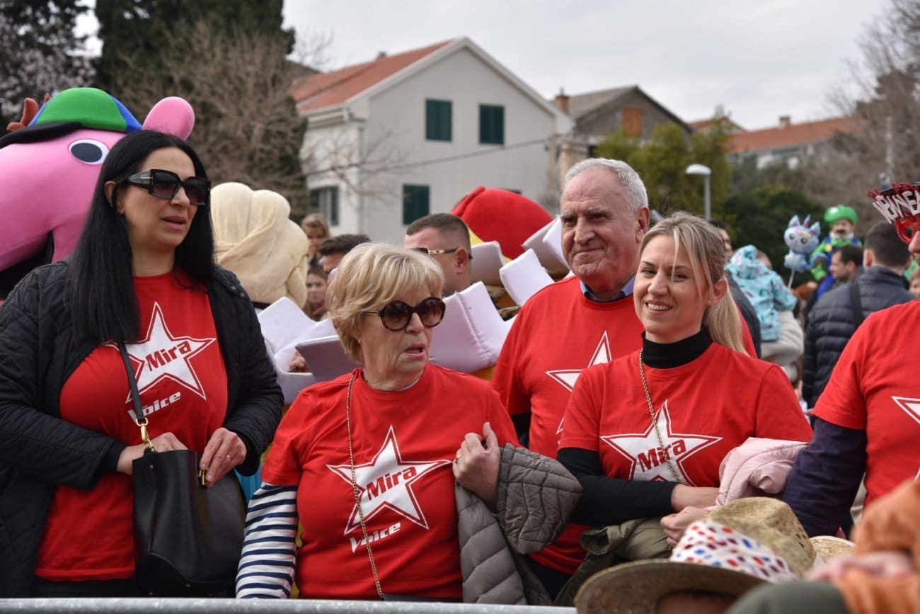 Maškarana povorka s veseljem je dočekala svoju sugrađanku Miru Oštrić, natjecateljicu Voica, koja je sinoć ušla u prva četiri mjesta. Mira je malim maškaricama otpjevala "Ništa nova", a u njenu čast zapalila se i pokoja bengalka.