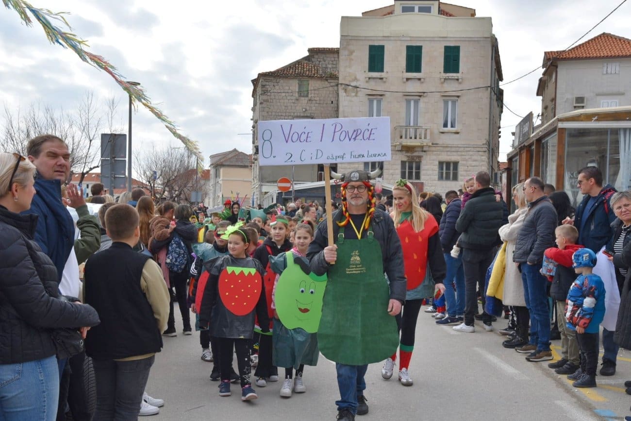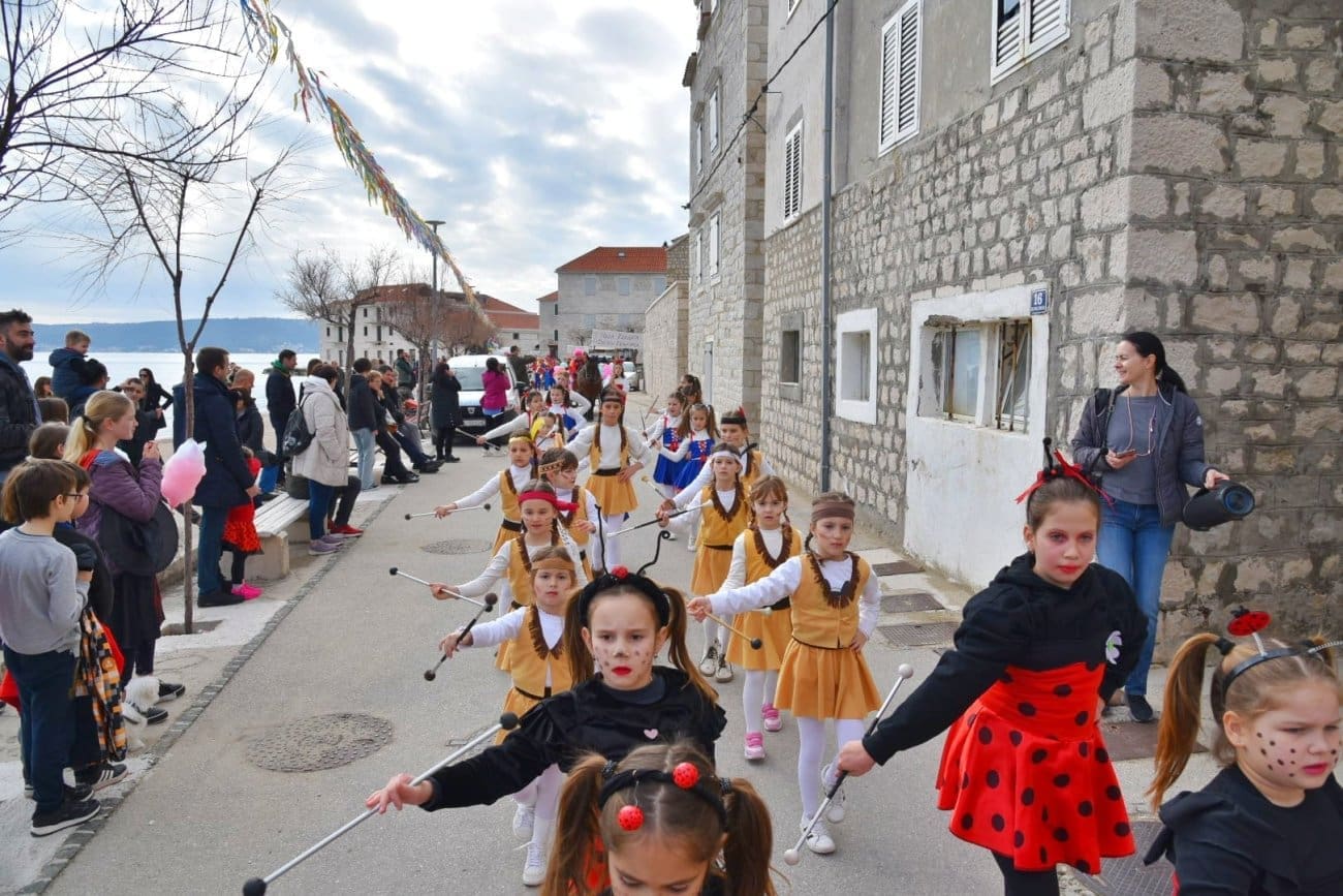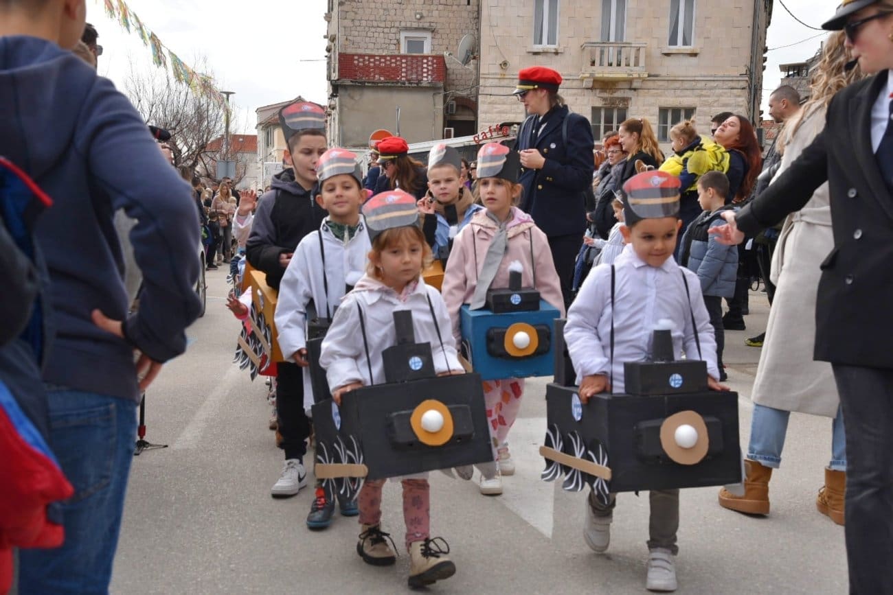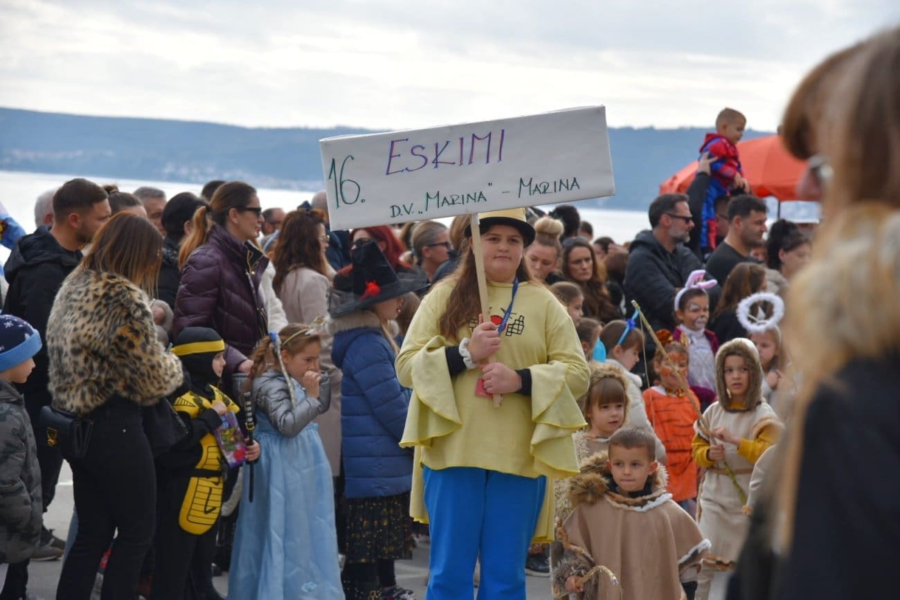 Povorka je krenula iz Lucijinog puta preko donjokaštelanske rive pa do parkinga ex. Plavi jadran, gdje je za sve sudionike organizirana zakuska i zabavni program. U 21. točki predstavila su se djeca iz odgojno-obrazovnih udruga pa smo mogli uživati u raznim maštovitim maskama koje su izradile vrijedne ruke teta iz vrtića. Puna donjokaštelanska riva ove nedjelje uživala je gledajući male vlaje, ribare, eskime, semafore, ovčice i mnoge druge. Ovogodišnji krnje, krivac za sve poteškoće djece, je Razmaženko Marendić.