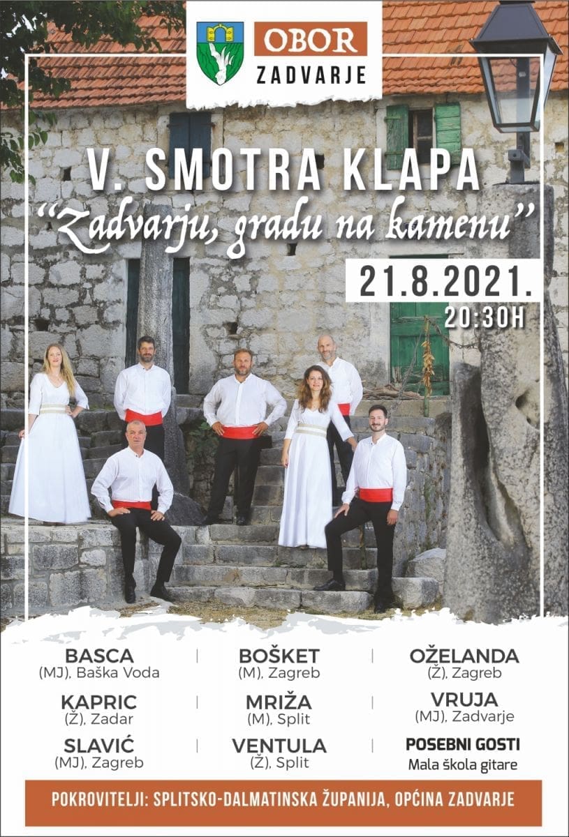 Već petu godinu zaredom dašak osvježenja u vruće ljetne dane u Zadvarje i cijelo Zabiokovlje donosi smotra klapa „Zadvarju, gradu na kamenu“. U tom pitoresknom mjestu duge i bogate povijesti, s vrijednom kulturnom i prirodnom baštinom, održat će se u subotu, 21. kolovoza 2021., na Oboru, glavnom mjesnom trgu, nadaleko poznati susret klapa koji rado posjećuju zaljubljenici u klapsku pismu iz svih kutaka Lijepe naše. U klapskim se krugovima ove godine toj smotri tepa kao brončanoj, odmah iza 55. Festivala dalmatinskih klapa u Omišu i 40. susreta klapa „Raspivano Bibinje“, s obzirom na impresivan popis klapa sudionica ovogodišnjega izdanja. To ne treba čuditi – zadvarska se smotra od samoga početka etablirala kao mjesto susreta ponajboljih klapskih sastava – klapskih olimpijaca iz cijele Hrvatske.