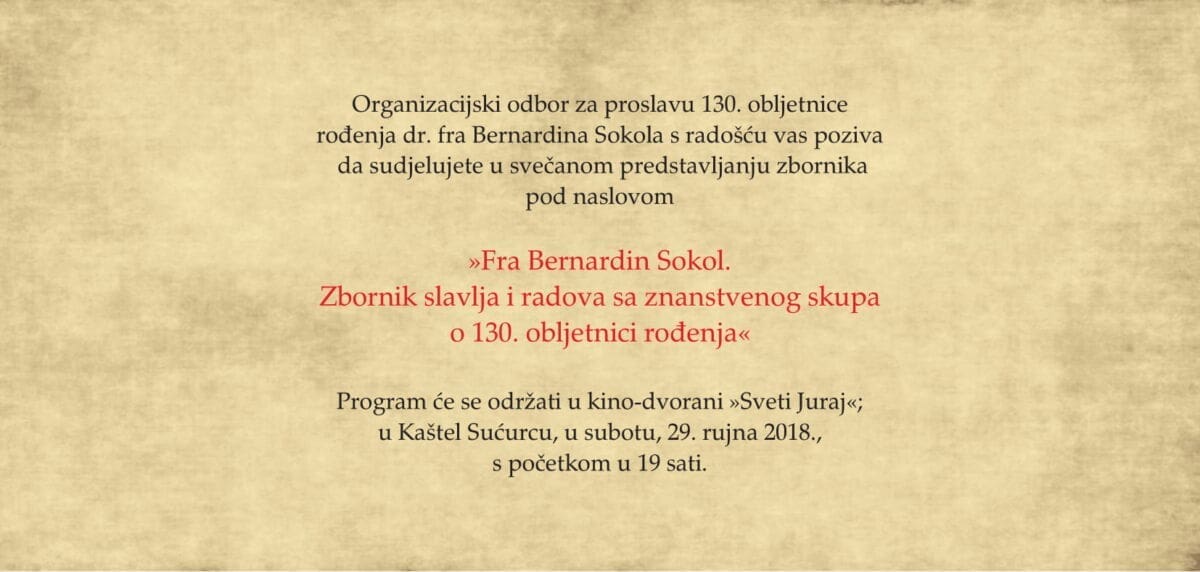 U sklopu obilježavanja 130. obljetnice fra Bernardinovog rođenja i 74. obljetnice smrti, u subotu 29. rujna u 19 sati u kino dvorani 'Sveti Juraj' u Kaštel Sućurcu bit će predstavljen Zbornik „Fra Bernardin Sokol. Zbornik slavlja i radova sa znanstvenog skupa o 130. obljetnici rođenja“.