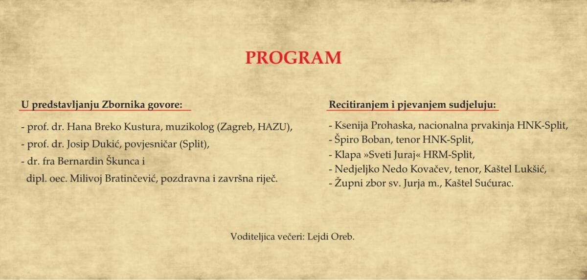 Zbornik će predstaviti: prof. dr. Hana Breko Kustura, muzikolog (Zagreb, HAZU) i prof. dr. Josip Dukić, povjesničar (Split), uz pozdravnu riječ dr. fra Bernardina Škunce i završno obraćanje Milivoja Bratinčevića. Voditeljica programa biti će Lejdi Oreb.