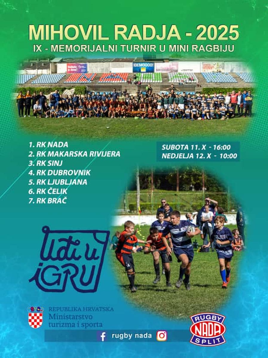 Ovog vikenda igralište na Starom Placu ponovno će biti ispunjeno dječjim smijehom, sportskim nadmetanjem i jajolikom loptom. Održava se 9. Memorijalni turnir mini ragbija "Mihovil Radja", u čast bivšeg igrača, trenera i predsjednika Ragbi kluba Nada – čovjeka koji je ostavio neizbrisiv trag u splitskom i hrvatskom ragbiju.