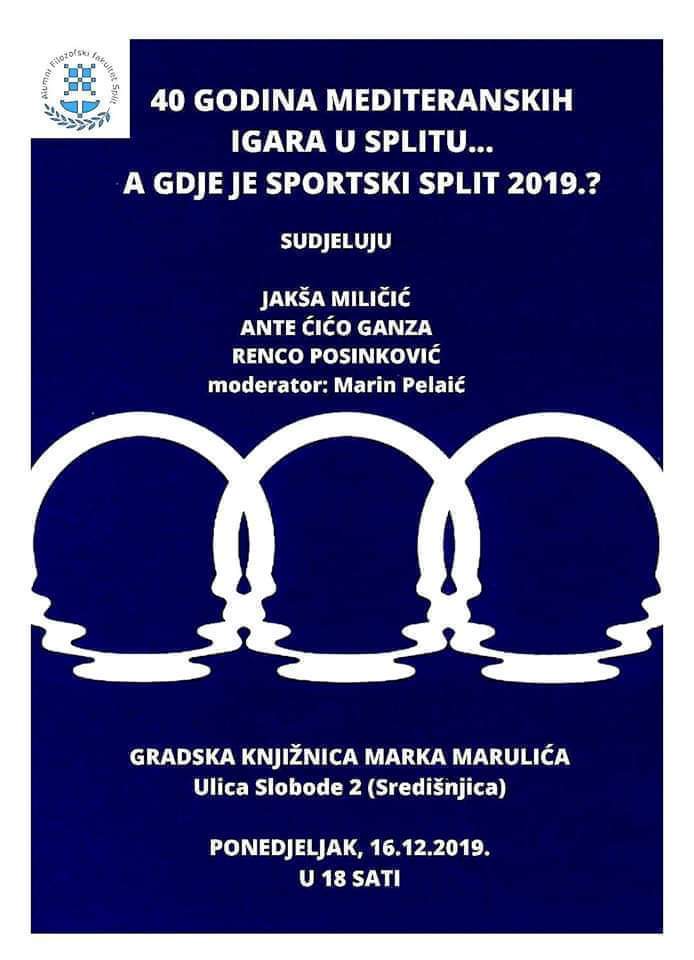 U središnjoj dvorani Gradske knjižnice Marka Marulića, Udruga Alumni Filozofskog fakulteta Split povodom 40 godina Mediteranskih igara u Splitu organizira tribinu o temi "A gdje je sportski Split 2019?"