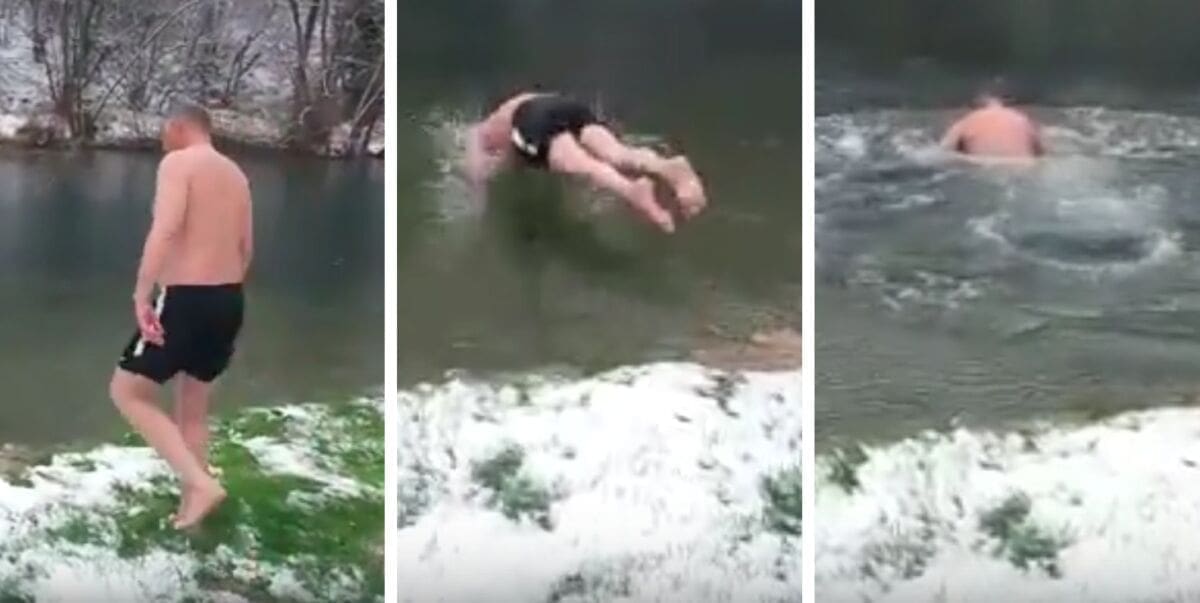 Današnjih deset centimetara snijega u njihovom mjestu odlučio je skokom u ledenu Cetinu, čija je temperatura tek nekoliko stupnjeva iznad nule, obilježiti član Lakomih avanturista, Zdravko Rodić - Čakur.