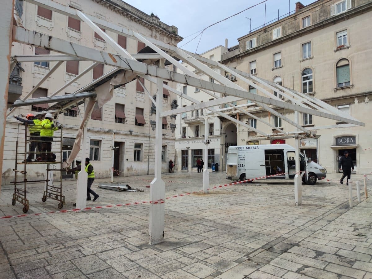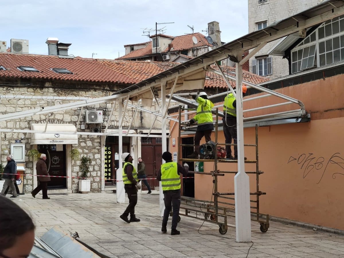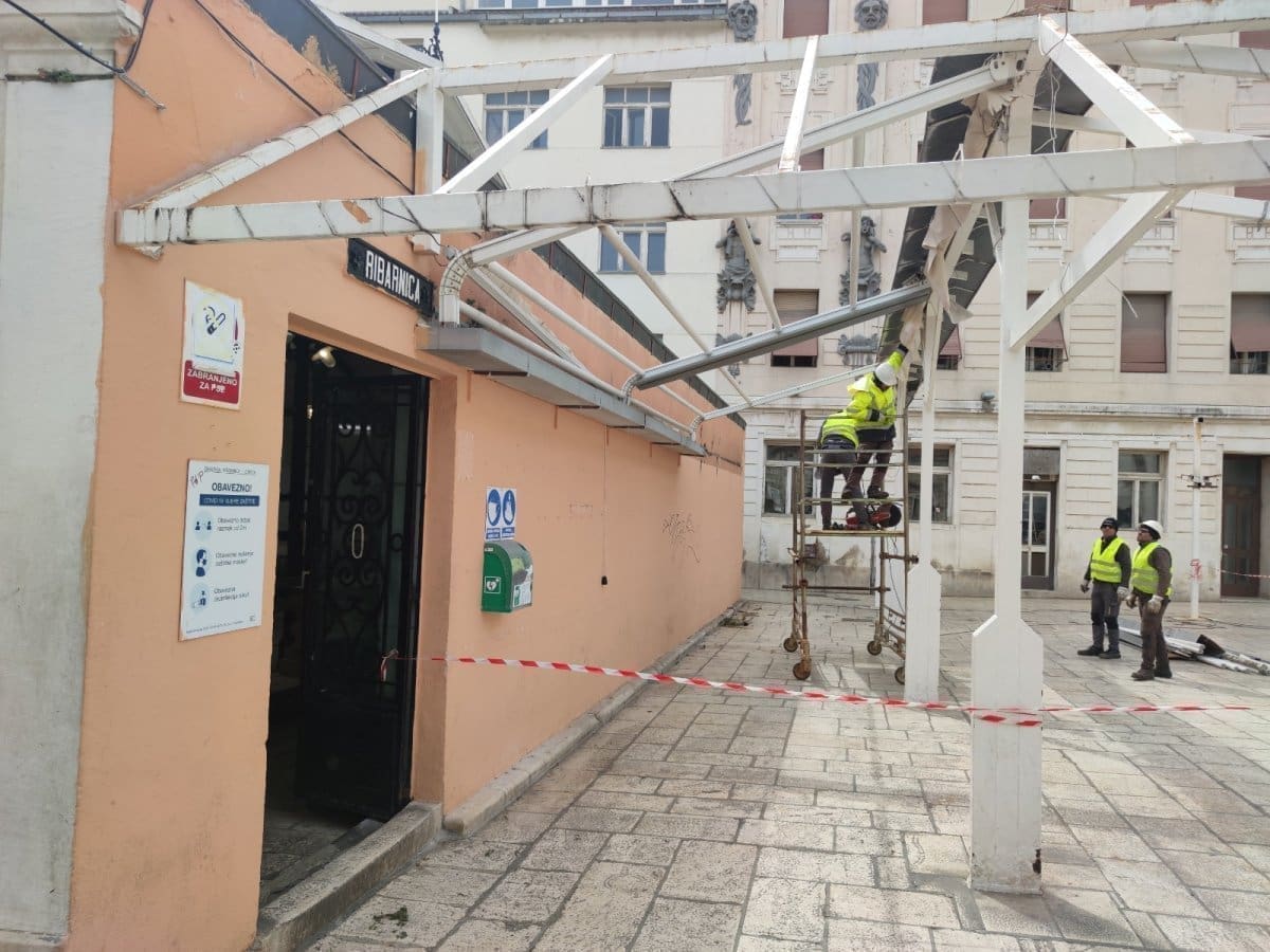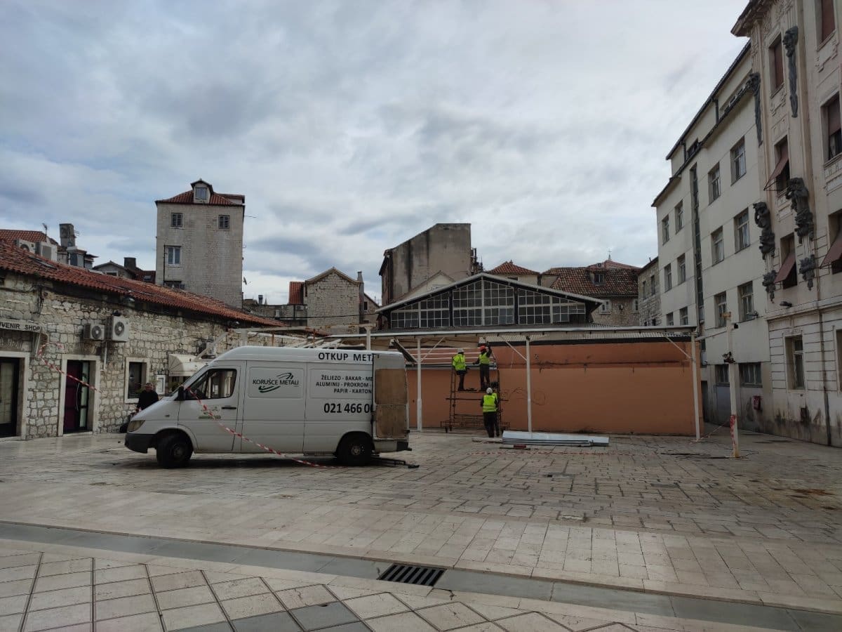 Tako smo jutros posjetili centar grada te se uvjerili da se radi punom parom. U tijeku je demontaža vanjske željezne tende.