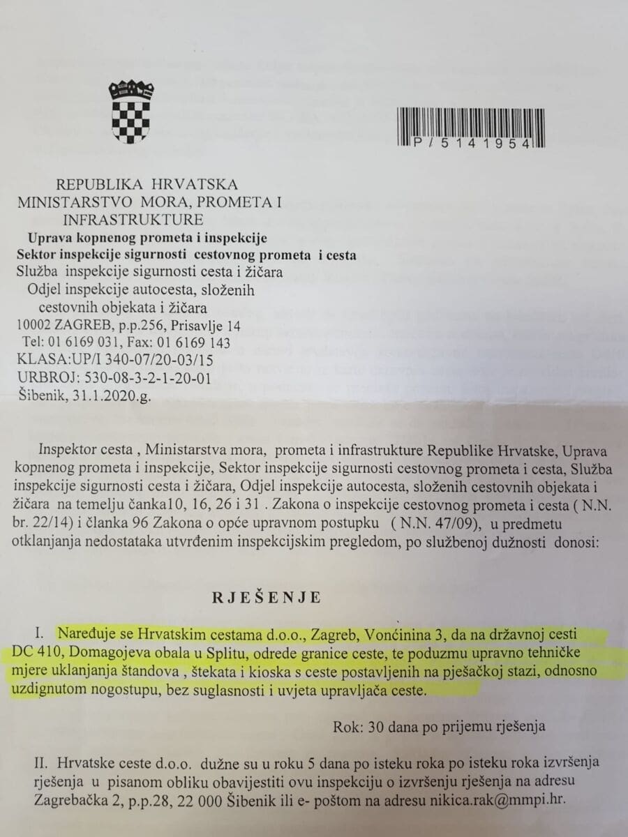 Sredinom siječnja je i Inspekcija Ministarstva mora, prometa i infrastruktura izašla na teren i Hrvatskim cestama naredila da u roku od 30 dana odrede granice ceste i poduzmu mjere uklanjanja štandova, štekata i kioska postavljenih na pločnik.