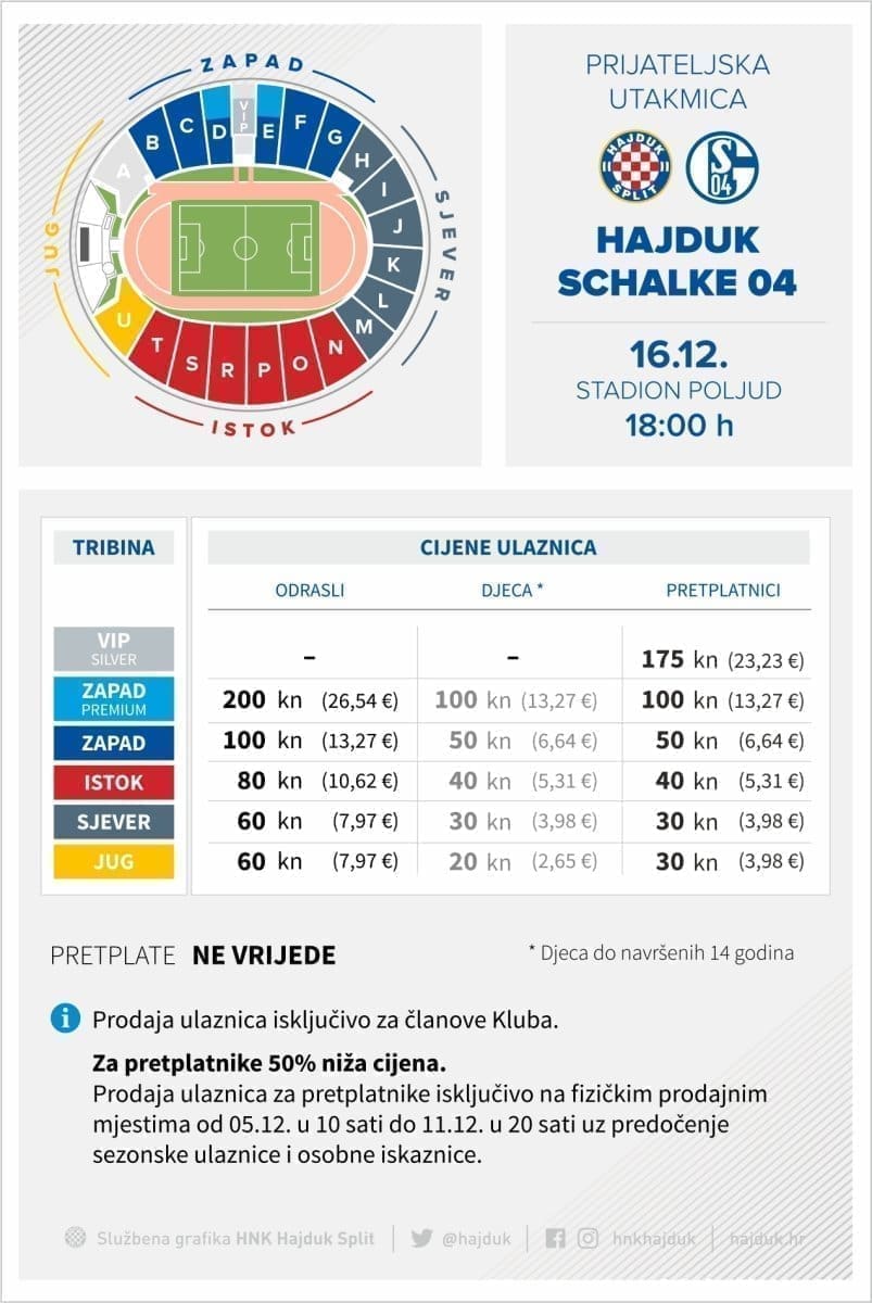 Započela je prodaja ulaznica za prijateljski susret između Hajduka i njemačkog velikana Schalkea koji će se odigrati na Poljudu, 16. prosinca s početkom u 18 sati, a ovo je prva dogovorena utakmica koju će Bijeli odigrati u okviru priprema za nastavak sezone.