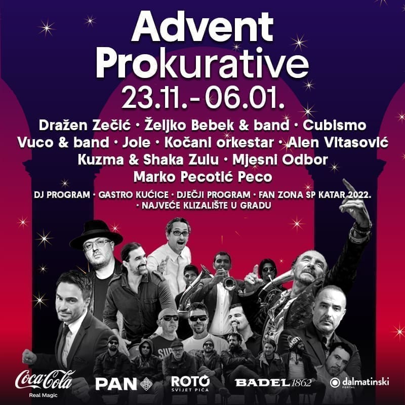 Narednih 46 dana na Prokurativama uslijedit će koncerti petkom i subotom kakve Prokurative već dugo nisu doživjele, gledanje utakmica Hrvatske nogometne reprezentacije na Svjetskom prvenstvu u Katru, nastupi DJ-a radnim danom, među kojima su DJ Duple, DJ Jakir, DJ Luka Barbić i mnogi drugi, bogati dječji program i radionice preko dana, besplatne predstave u režiji GKM-a, a kao šlag na početku i kraju svakog dana - najveće i najraskošnije klizalište u Splitu!