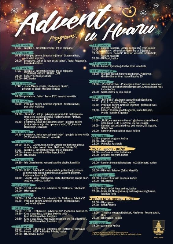 Program u organizaciji Grada Hvara i u suradnji s gradskim udrugama, društvima i ustanovama te Župom Hvar uključuje koncerte klasične i duhovne glazbe, koncerte na otvorenom ispred Lođe, gostovanja kazališnih predstava u najstarijem komunalnom kazalištu Europe, razne kreativne radionice i čitaonice za djecu, postavljanje božićnog drvca pod morem, kvizove, projekcije božićnih filmova, tradicionalnu podjelu bakalara i božićni sajam, kao i Dječji doček Nove godine na Silvestrovo u podne.