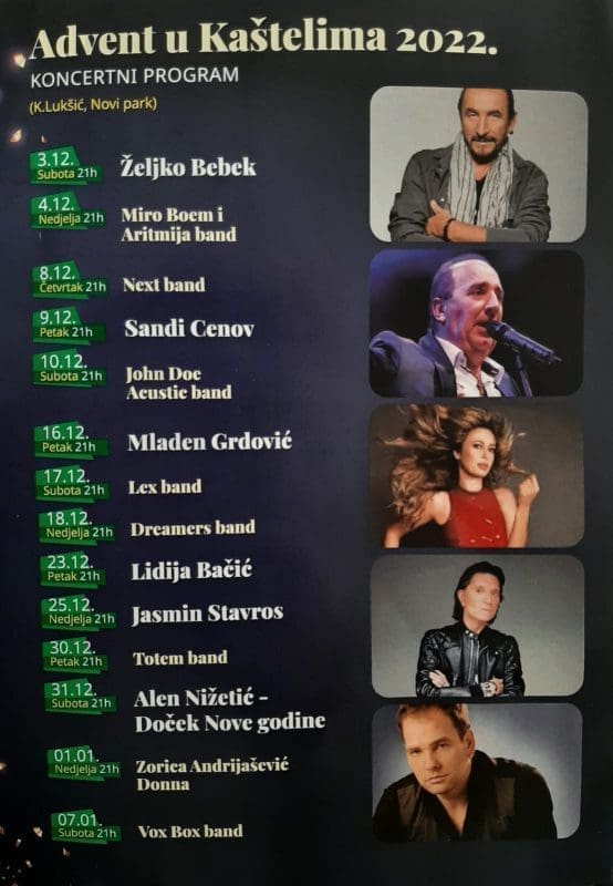 Željko Bebek , Sandi Cenov, Alen Nižetić, Mladen Grdović, Jasmin Stavros , Lidija Bačić samo su jedni od izvođača koji će ovaj Advent učiniti nezaobilaznim mjestom za dobru zabavu u Kaštelima.