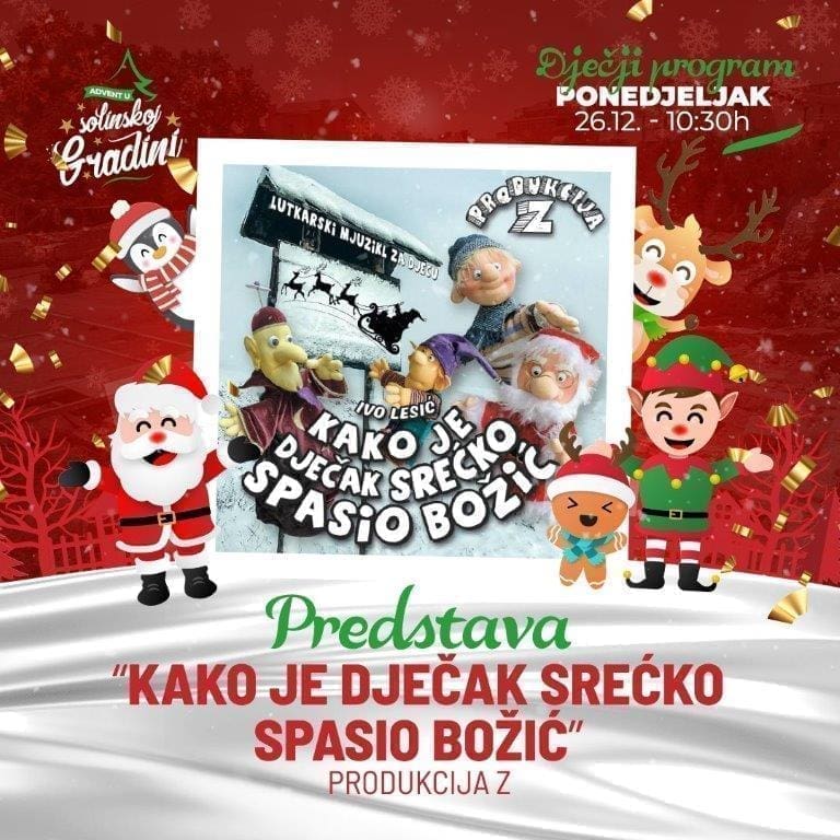 U ponedjeljak, 26. prosinca, tjedan započinje bogatim programom za najmlađe. U 10.30 sati održat će se predstava “Kako je dječak Srećko spasio Božić” u izvedbi produkcije Z. Djeca i odrasli mogu istražiti i kutak Djeda Božićnjaka s vilenjacima te prisustvovati radionici.