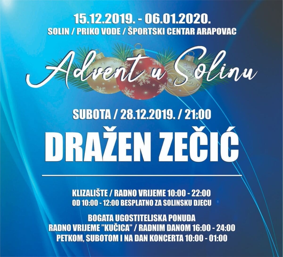 Bogat božićno-novogodišnji program Advent u Solinu nastavlja se koncertom Dražena Zečića u subotu 28. prosinca 2019. s početkom u 21 sat na platou pored sportske dvorane Osnovne škole kraljice Jelene.