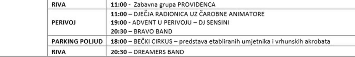 U utorak, na Badnjak program će se odvijati na nekoliko lokacija. Na Prokurativama će se dijeliti bakalar i fritule, na Pjaci će biti DJ program, a za glazbu će se pobrinuti Duple, Dado i Sola. Na Rivi će se odvijati glazbeni program 'Blagoslovljeni i romantični Badnjak', a koncert će održati sastav Romansa pod zvijezdama i violinistica Majda Goluža. Navečer nas očekuje koncert Aurora banda, a u Perivoju DJ Peco.