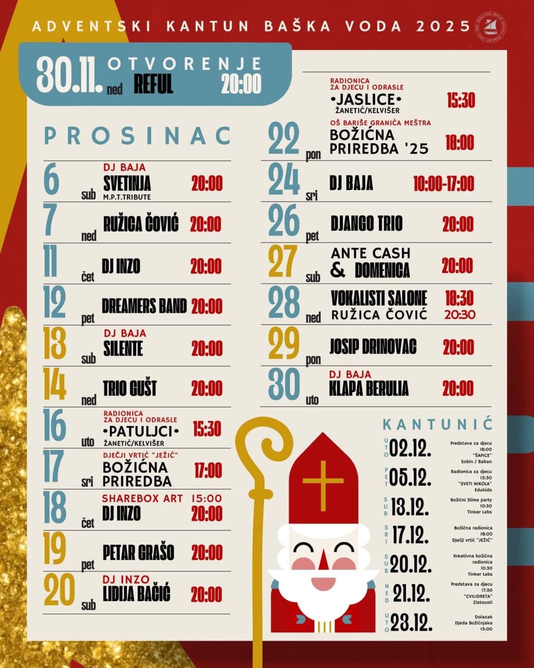 Uz miris kuhanog vina, zvuk božićnih pjesama i šušur druženja, Adventski kantun Baška Voda 2025. obećava nezaboravne trenutke. U srcu rivi, pod blagdanskim svjetlima, posjetitelji će imati priliku osjetiti istinski duh blagdana – onaj koji spaja ljude i stvara uspomene koje se pamte.