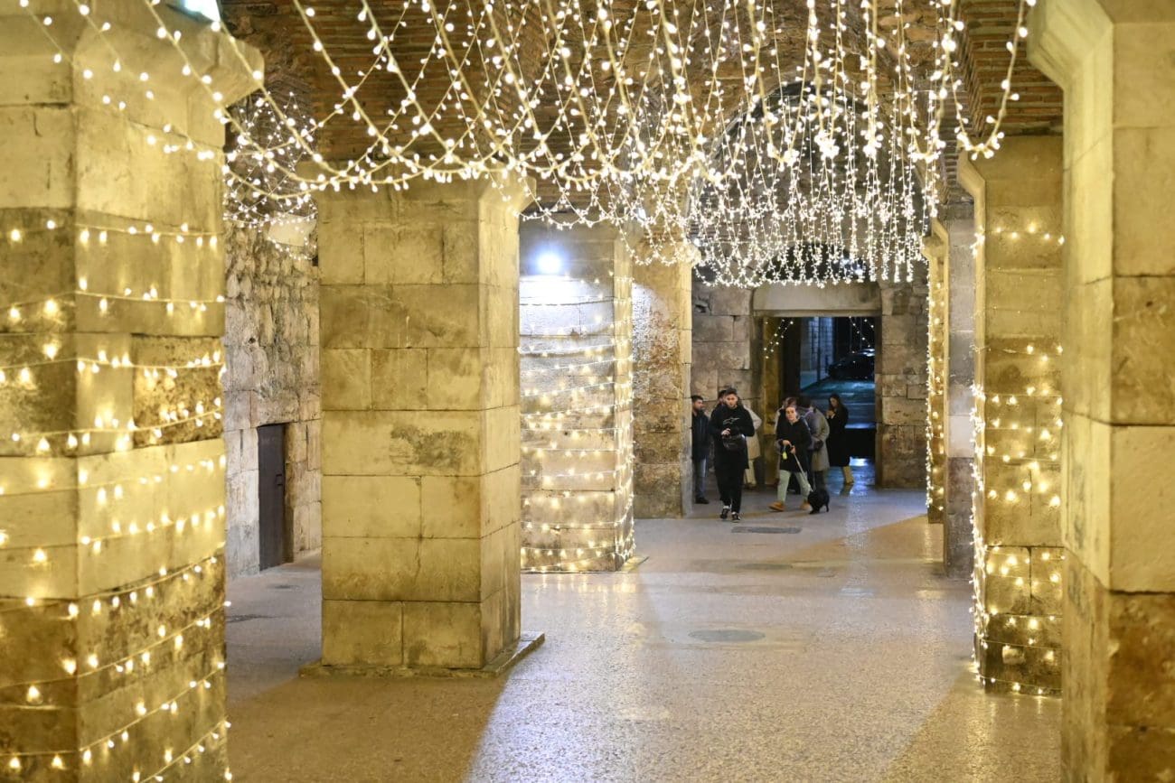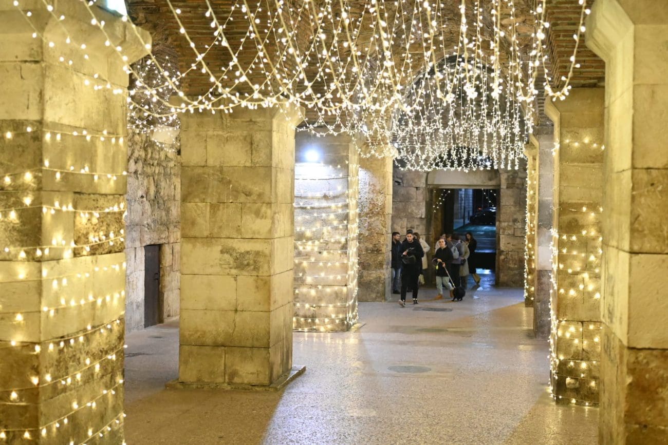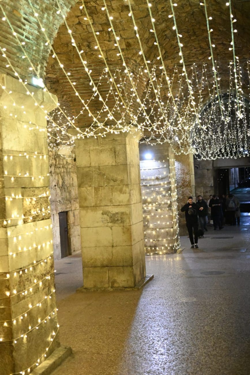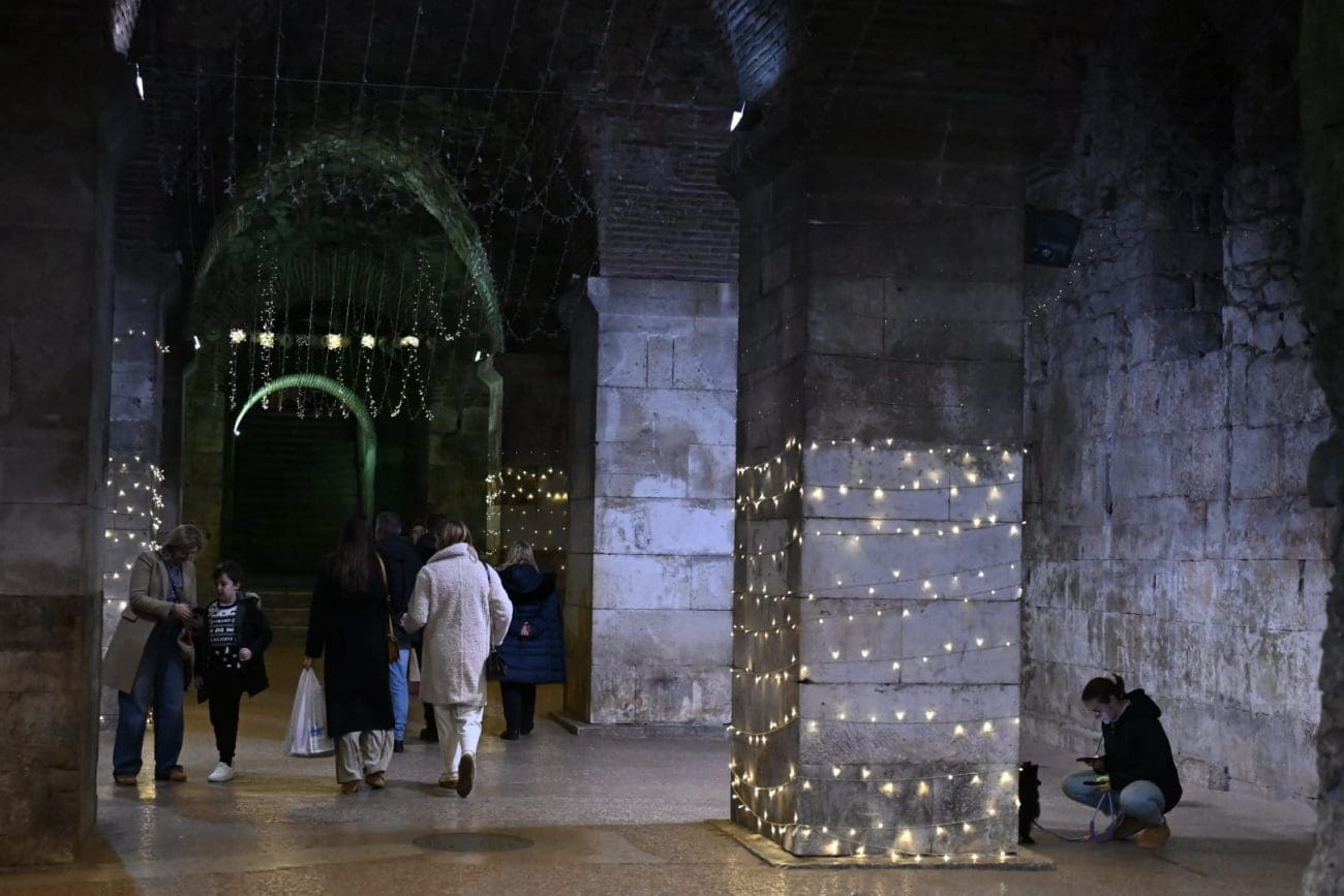 Krenuli smo iz Dioklecijanovih podruma, gdje se kamen i stoljeća povijesti stapaju s toplinom blagdanske dekoracije. Prolaznici zastaju, fotografiraju, uživaju... Iz podruma put vodi prema Peristilu, koji u ovo doba godine dobiva posebno svečani izgled, a mnoštvo ljudi stvaraju onu poznatu splitsku mješavinu tradicije, druženja i spontane radosti.