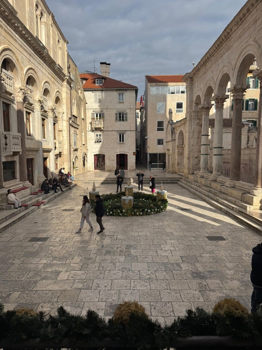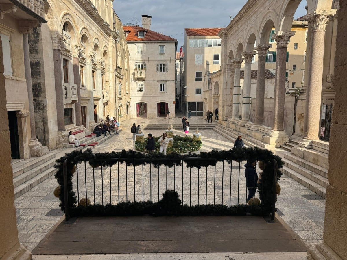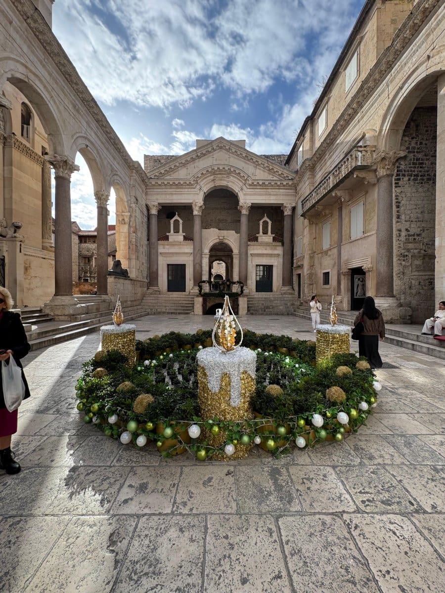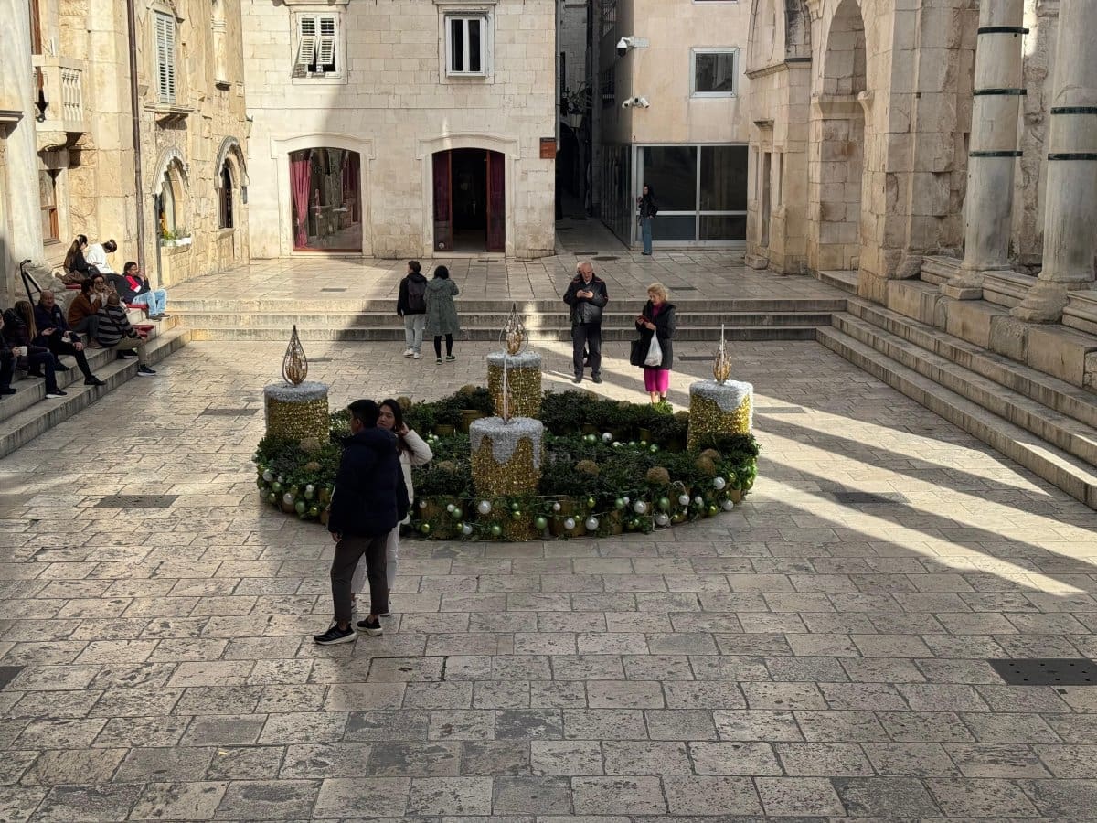 Postavljen je veliki adventski vijenac, a za razliku od prijašnjih godina, ove je godine smješten - na Peristil. Dao je jedan sasvim poseban ugođaj tom carskom trgu.