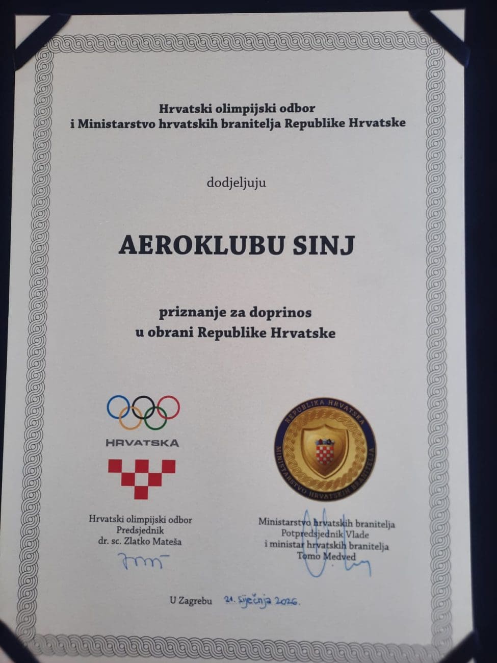 Među dobitnicima kolektivnog priznanja nalazi se i Aeroklub Sinj, kojem je priznanje dodijeljeno na temelju organiziranog sudjelovanja dijela njegovih članova u Domovinskom ratu te stavljanja svih tadašnjih klupskih resursa i opreme na raspolaganje u svrhu obrane Republike Hrvatske.