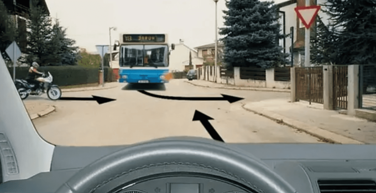 Jedan od zadataka iz HAK-ovog testa za vozače izazvao je raspravu na društvenim mrežama koja ne prestaje već tjednima. Na fotografiji su prikazani automobil (u kojem ste, zamislite, vi), motocikl, autobus i prometni znakovi.