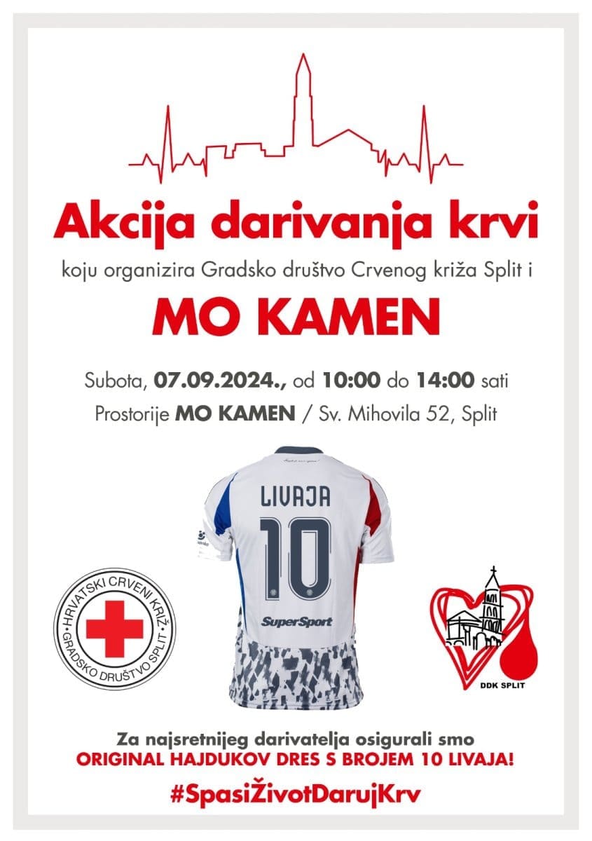 "Za ovu jubilarnu 🔟. AKCIJU DARIVANJA KRVI NA KAMENU 🩸 darujemo NAJSRETNIJEG DARIVATELJA 𝐎𝐑𝐈𝐆𝐈𝐍𝐀𝐋𝐍𝐈𝐌 𝐇𝐀𝐉𝐃𝐔𝐊𝐎𝐕𝐈𝐌 𝐃𝐑𝐄𝐒𝐎𝐌 s brojem 🔟 našeg kapetana 𝐌𝐀𝐑𝐊𝐀 𝐋𝐈𝐕𝐀𝐉𝐄 ❤️💙