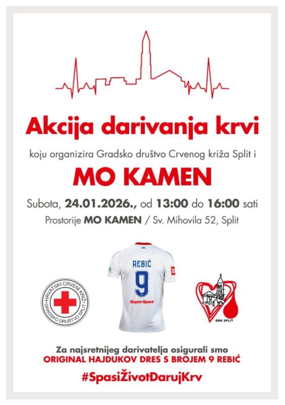 Gradsko društvo Crveni križ Split u suradnji s MO Kamen organizira akciju darivanja krvi koja će se održati u subotu, 24. siječnja 2026. godine, u prostorijama Mjesnog odbora Kamen na adresi Svetog Mihovila 52 u Splitu. Akcija će trajati od 13 do 16 sati, a pozvani su svi građani dobre volje koji žele svojim darivanjem pomoći onima kojima je krv najpotrebnija.