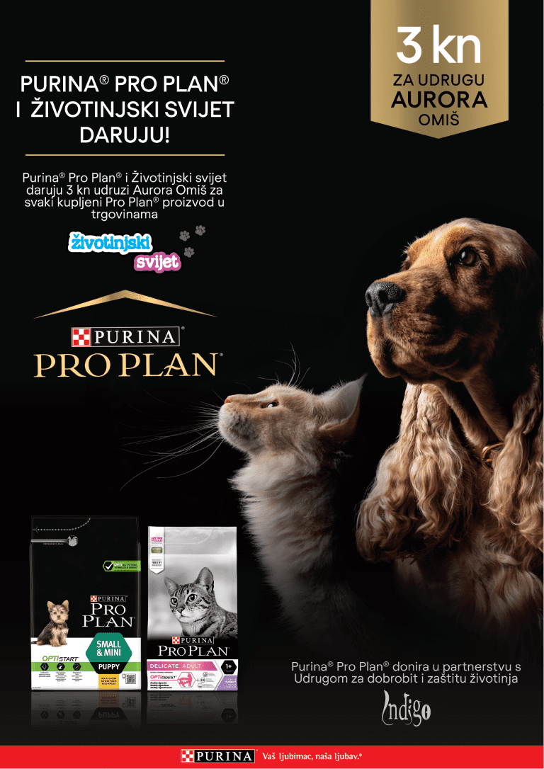 ŽIVOTINJSKI SVIJET sa svojim partnerom PURINA PRO PLAN, u skladu sa svojom tradicijom pomaganja nezbrinutim i unesrećenim šapicama, pokreće akciju kojom za kupnju svakog artikla PURINA PRO PLAN doniramo 3 KUNE udruzi "AZIL AURORA" iz Omiša.