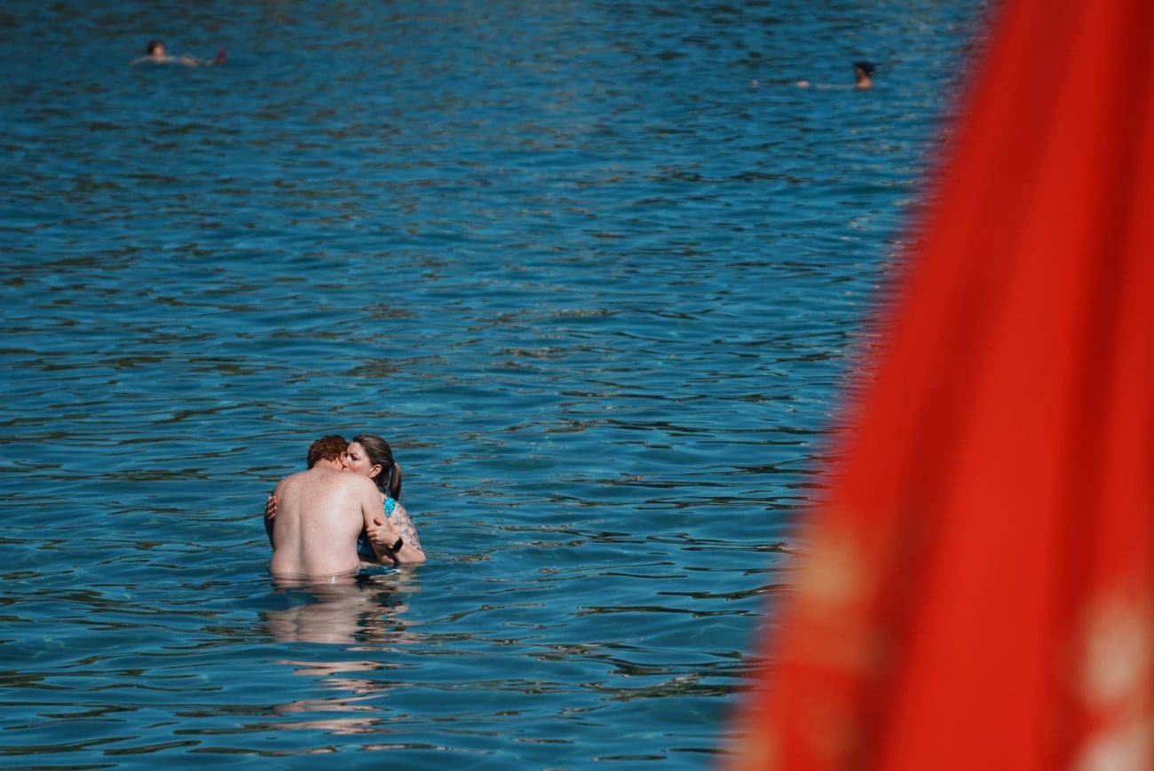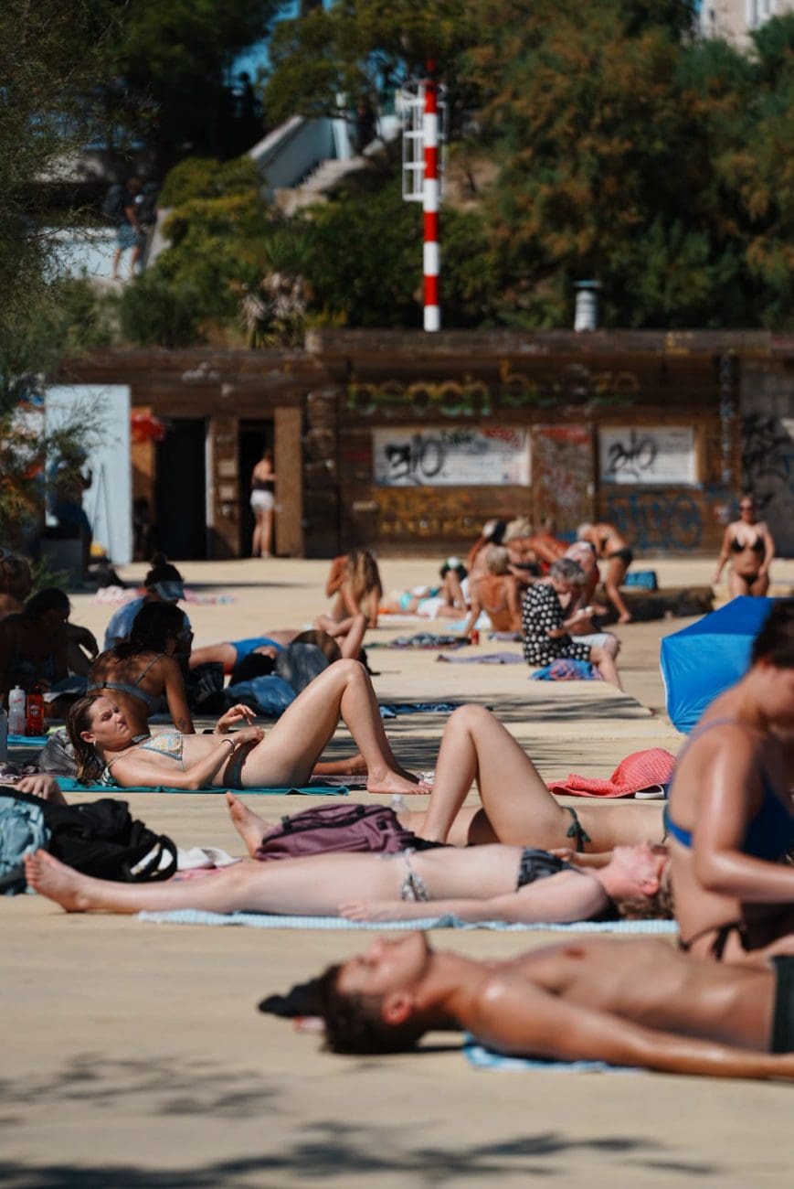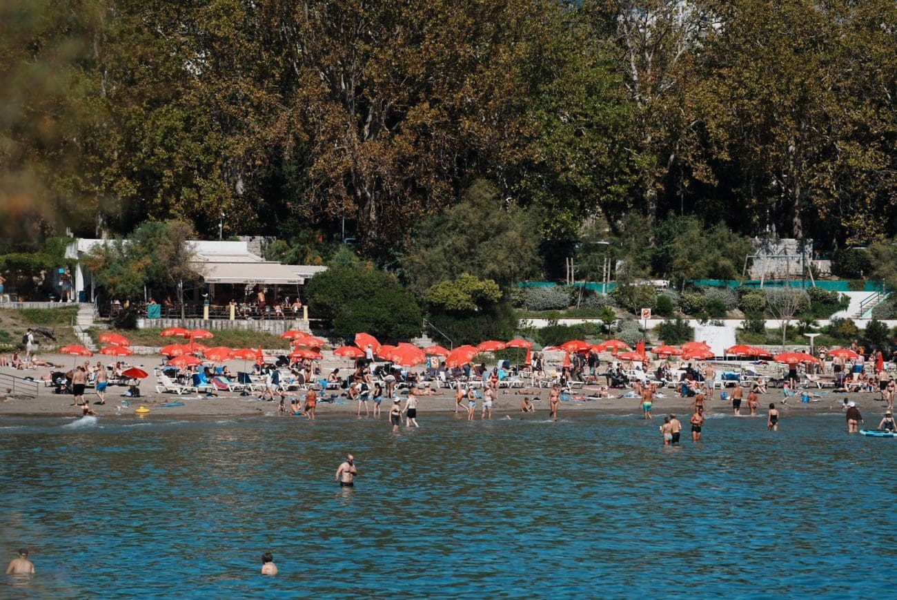 Plaža je prepuna domaćih i stranih gostiju, more je mirno i ugodno, a valovi su danas zamijenjeni smijehom i razgovorom na pijesku. Dok jedni uživaju pod crvenim suncobranima, drugi hvataju zadnje ljetne zrake na ručnicima uz more ili ispijaju piće u obližnjim kafićima.
