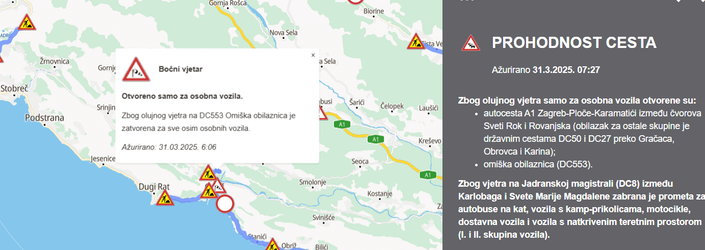 Zbog olujnog vjetra samo za osobna vozila otvorene su autocesta A1 Zagreb-Ploče-Karamatići između čvorova Sveti Rok i Rovanjska (obilazak za ostale skupine je državnim cestama DC50 i DC27 preko Gračaca, Obrovca i Karina) kao i omiška obilaznica (DC553).
