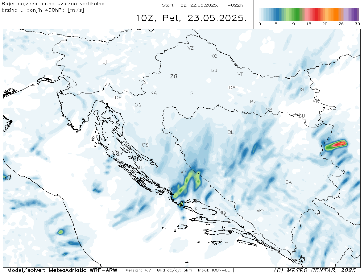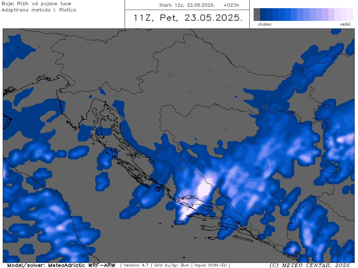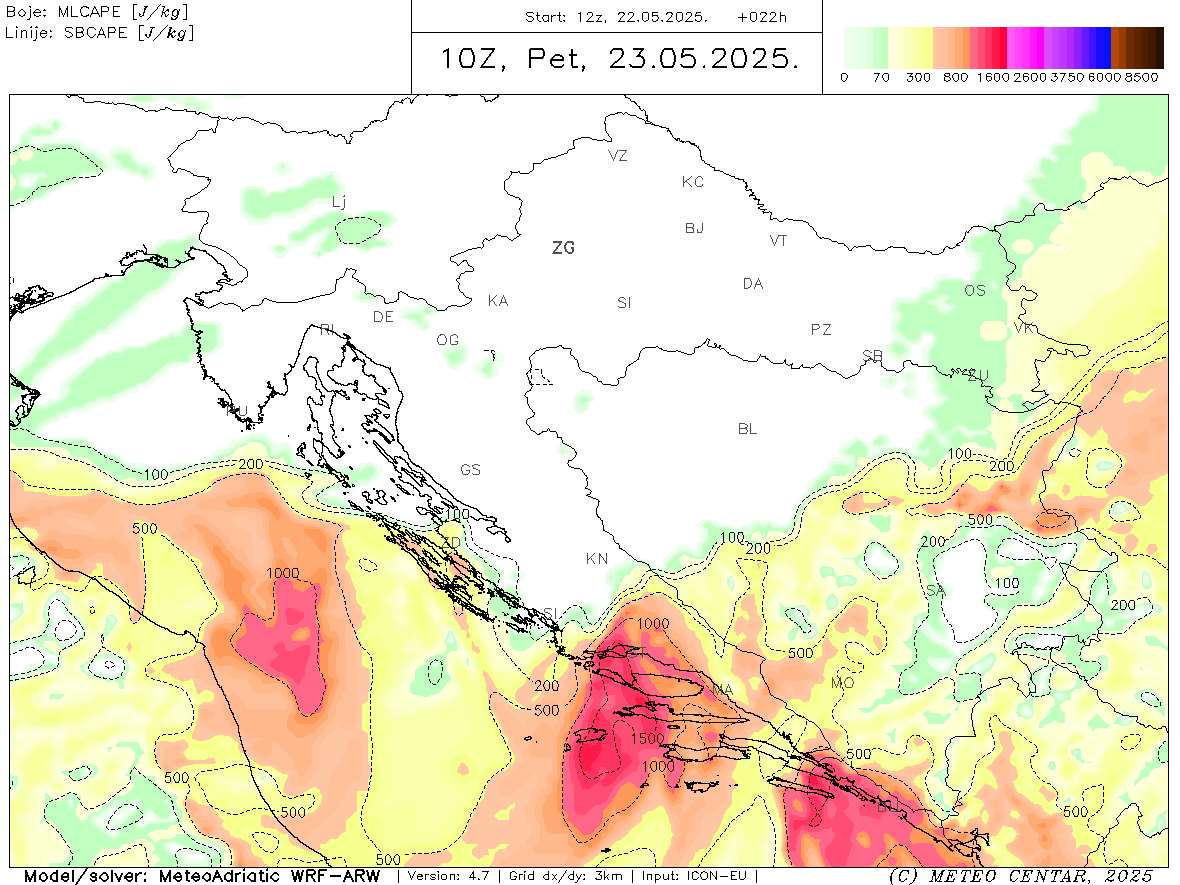 Konvektivni parametri na MeteoAdriaticu upućuju na umjereno veliku mogućnost lokalno izraženog nevremena na sjevernom i srednjem Jadranu, Lici i Gorskom kotaru, ponegdje uz tuču. Podno Velebita će zapuhati jaka do olujna bura.