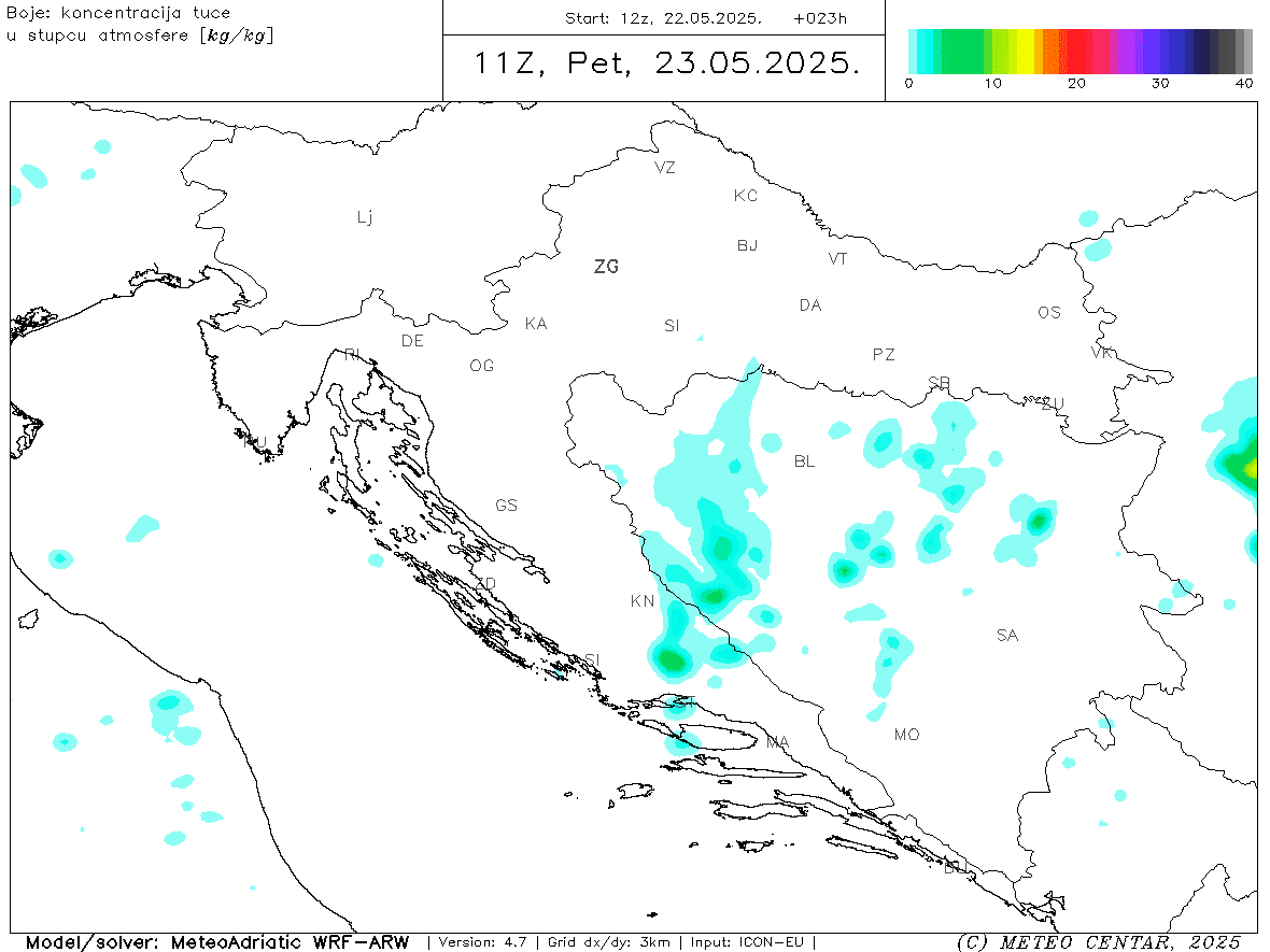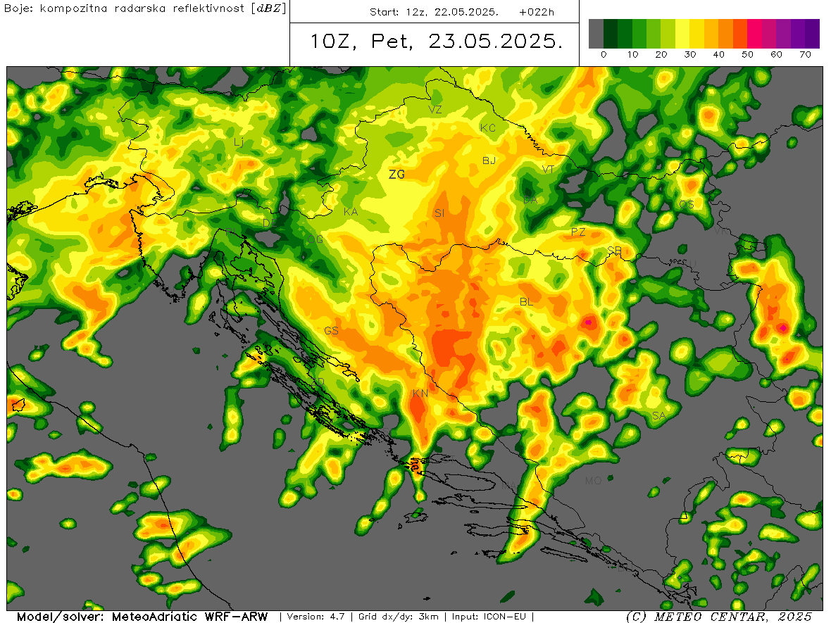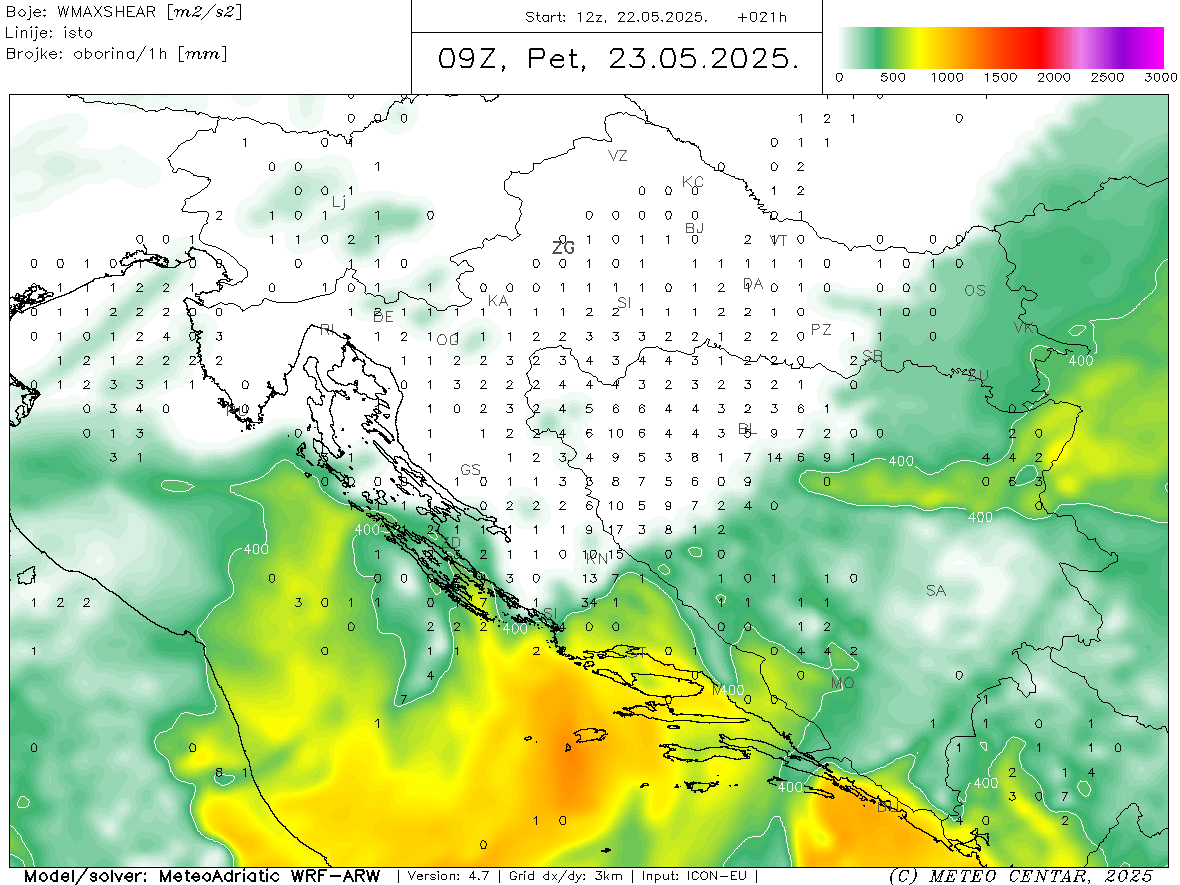 Konvektivni parametri na MeteoAdriaticu upućuju na umjereno veliku mogućnost lokalno izraženog nevremena na sjevernom i srednjem Jadranu, Lici i Gorskom kotaru, ponegdje uz tuču. Podno Velebita će zapuhati jaka do olujna bura.