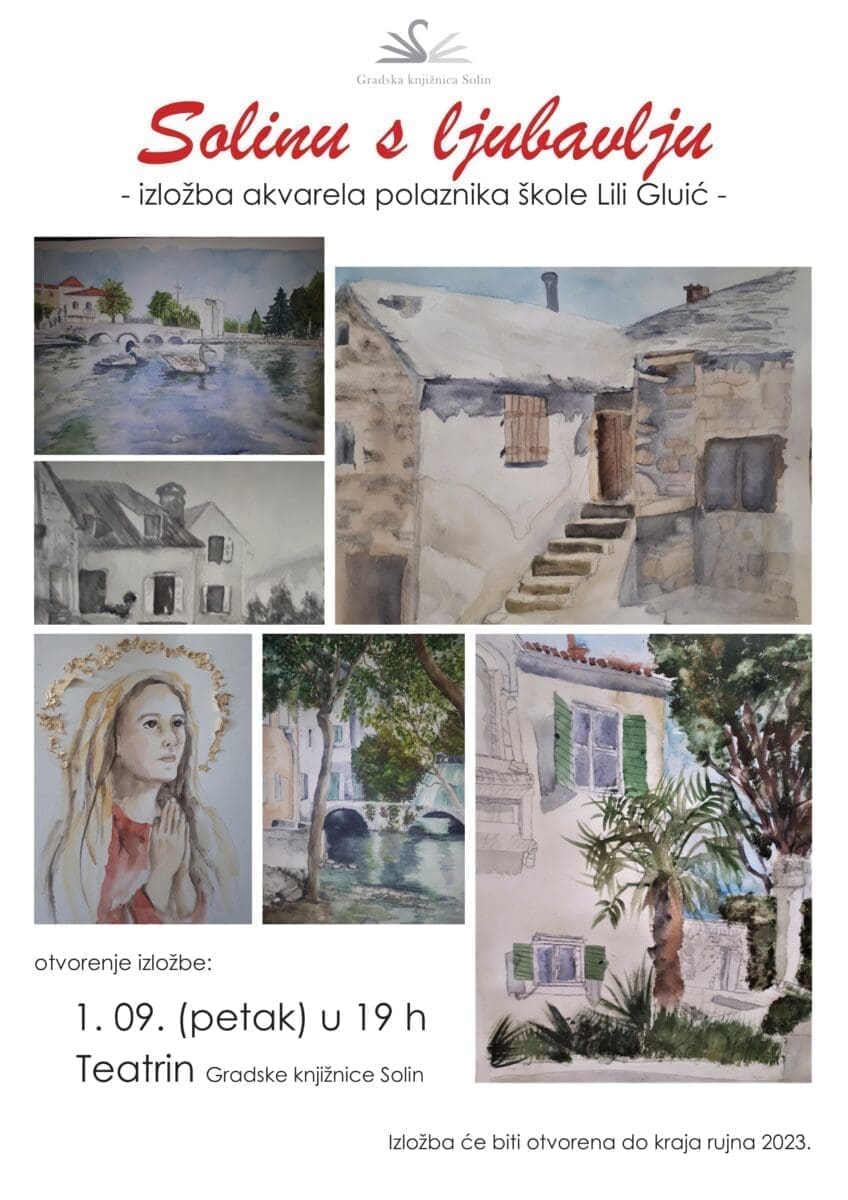 Gradska knjižnica Solin poziva na otvorenje izložbe akvarela polaznika škole crtanja Lili Gluić „Solinu s ljubavlju“. Otvaranje će se održati u Teatrinu Gradske knjižnice Solin, u petak, 1. rujna s početkom u 19 sati.