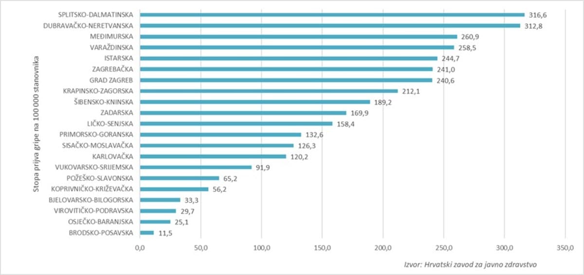 Prijave gripe zaprimljene su iz svih županija, pri čemu se u 50. tjednu najveća stopa prijava gripe na 100 000 stanovnika bilježi u Splitsko-dalmatinskoj i Dubrovačko-neretvanskoj županiji.