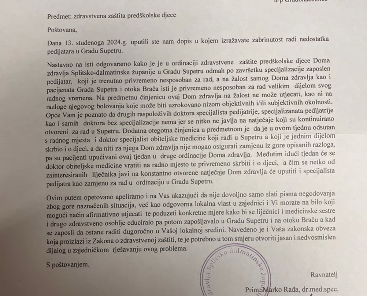 "Šokirana i razočarana obraćam vam se u ime svih zabrinutih roditelja grada Supetra i cijelog otoka Brača. Medicinska skrb je osnova koju su zaslužili svi, a osobito naša djeca. Situacija u kojoj pedijatrija praktički ne funkcionira je poražavajuća i neprihvatljiva", navodi gradonačelnica. Dodala je kako rad Odjela pedijatrije ovisi gotovo isključivo o jednoj medicinskoj sestri koja požrtvovno obavlja svoj posao, dok je pedijatar stalno odsutan.