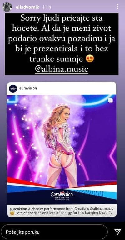 "Ali da je meni život podario ovakvu pozadinu i ja bi je prezentirala i to bez trunke sumnje", dodala je Ella i objavila fotografiju objavljenu na Instagramu Eurovizije.