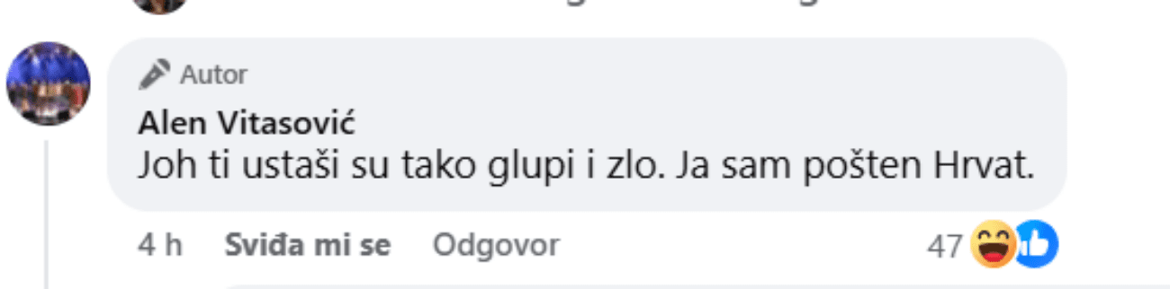 No, dodatne reakcije izazvao je i njegov komentar ispod objave, u kojem je napisao: “Joh ti ustaši su tako glupi i zlo. Ja sam pošten Hrvat.”