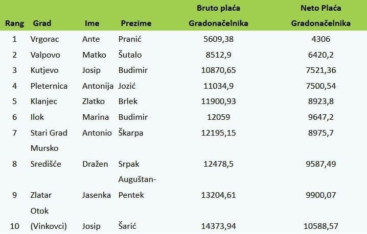 Na petom je mjestu Zlatko Brlek iz Klanjca s plaćom od 11.900 kuna bruto (8.923 neto), potom Marina Budimir iz Iloka – 12.059 kuna bruto (9.647 neto) te Antonio Škarpa iz Starog Grada na Hvaru – 12.195 kuna bruto (8.975 kuna neto). U top deset gradonačelnika s najnižom plaćom su još Dražen Srpak (Mursko Središće) – 12.478 kuna bruto (9.587 kuna neto), Jasenka Auguštan Pentek (Zlatar) – 13.204 kune bruto (9.900 neto) te Josip Šarić (Otok) sa plaćom od 14.373 kuna bruto. Šarić je ujedno i jedini iz top 10 najštedljivijih što se plaća tiče čija neto plaća premašuje 10 tisuća kuna, mjesečno on za svoj posao prima 10.588 kuna.