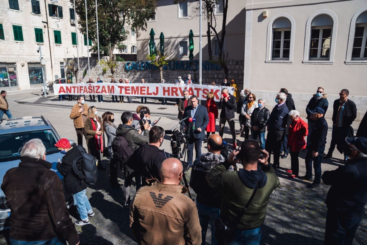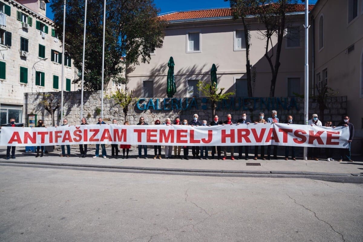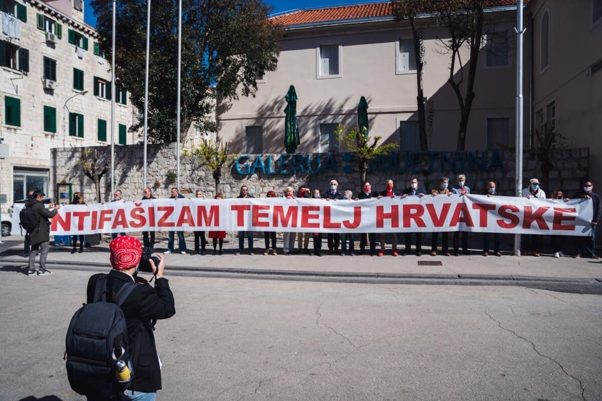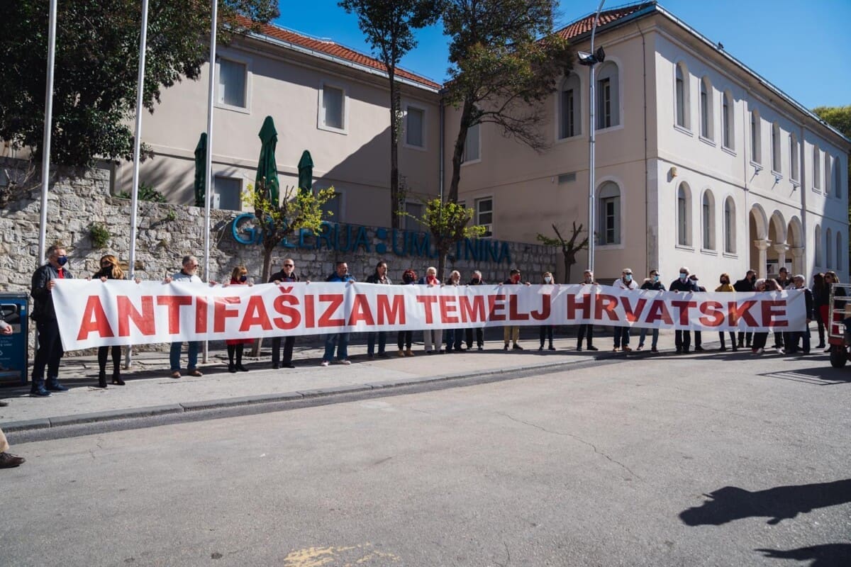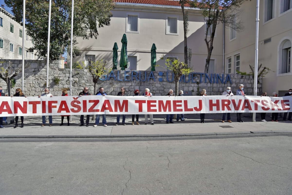 Jutros je pred splitskom Galerijom umjetnina razvijen transparent na kojem je stajalo "Antifašizam temelj hrvatske".