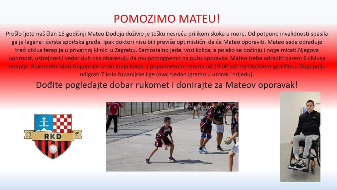 Dođite i pogledajte dobar rukomet i donirajte za Mateov oporavak", kazali su iz RK Dugopolje.