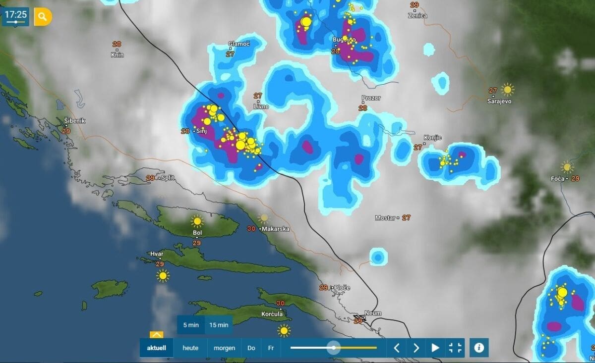 Danas je u popodnevnim satim grmljavinsko nevrijeme zahvatilo granično područje Dalmacije i BiH, a ova ga je aplikacija pedvidjela u kilometar! Kako je to na prikazu izgledalo oko 17:30 pogledajte na 4 razine zooma koje nudi desktop verzija Vrijeme & radar: